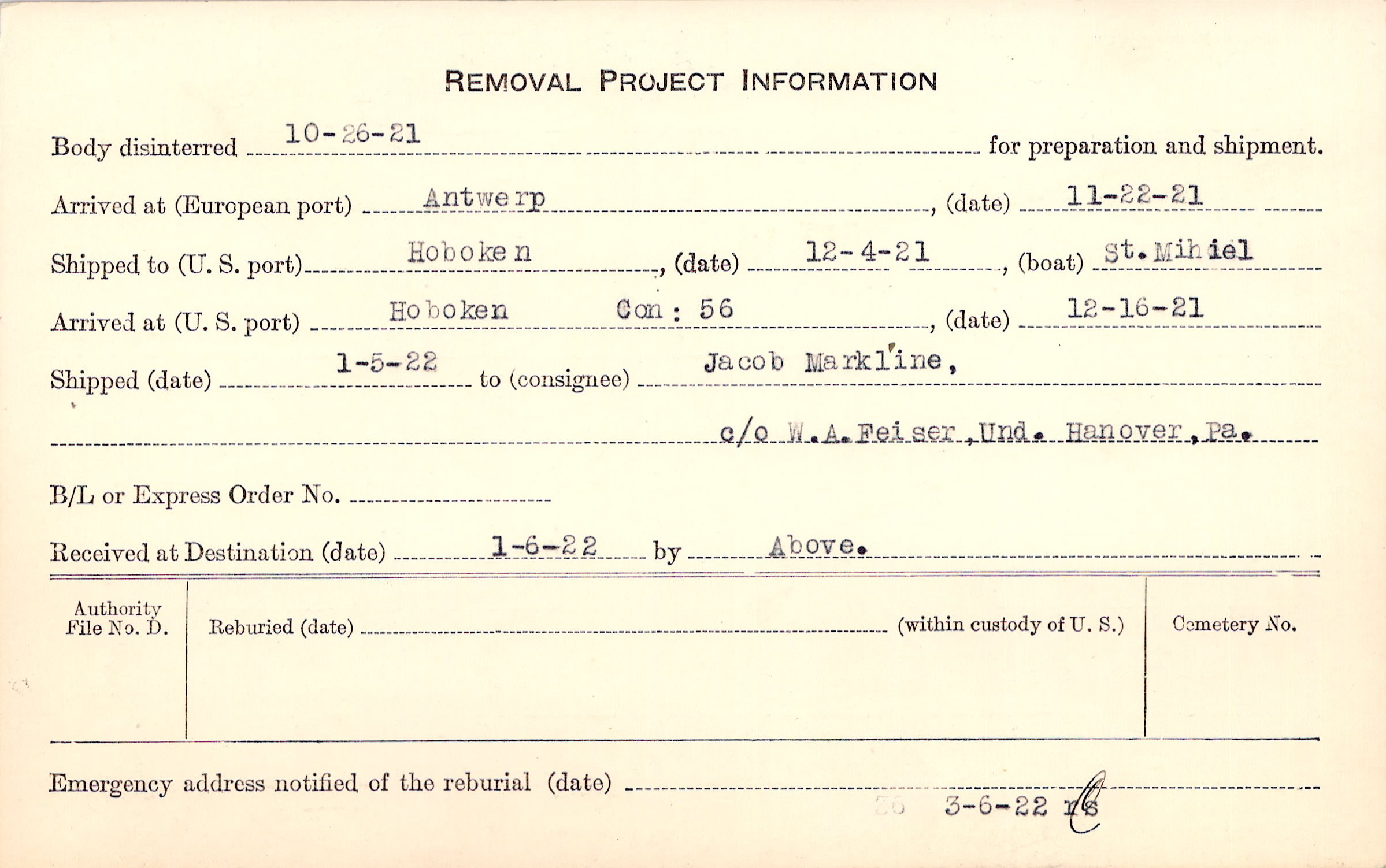 to Jacob Markline, c/o W.A. Feiser, Und., Hanover, Pa.