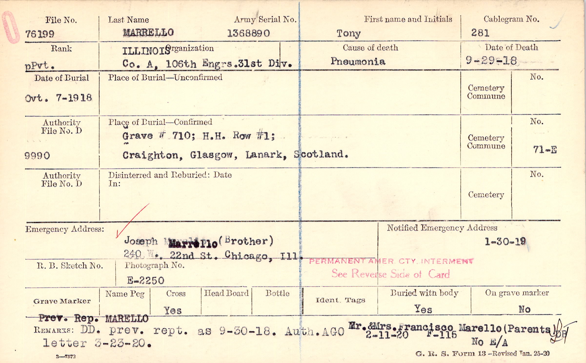 Joseph Marrello (Brother), 240 W. 22nd St. Chicago, Ill.