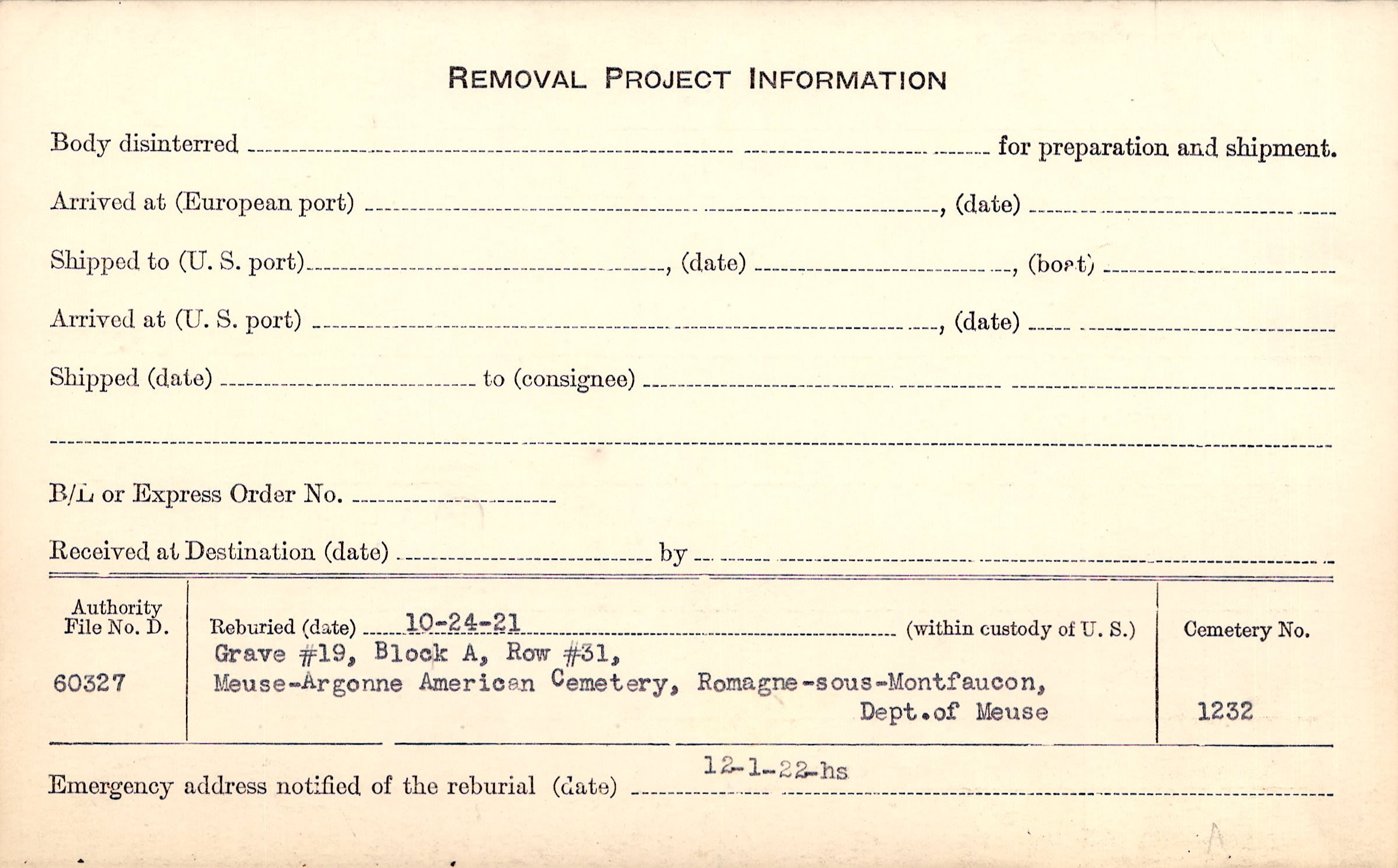 | Permanent Burial in Foreign Cemetery |