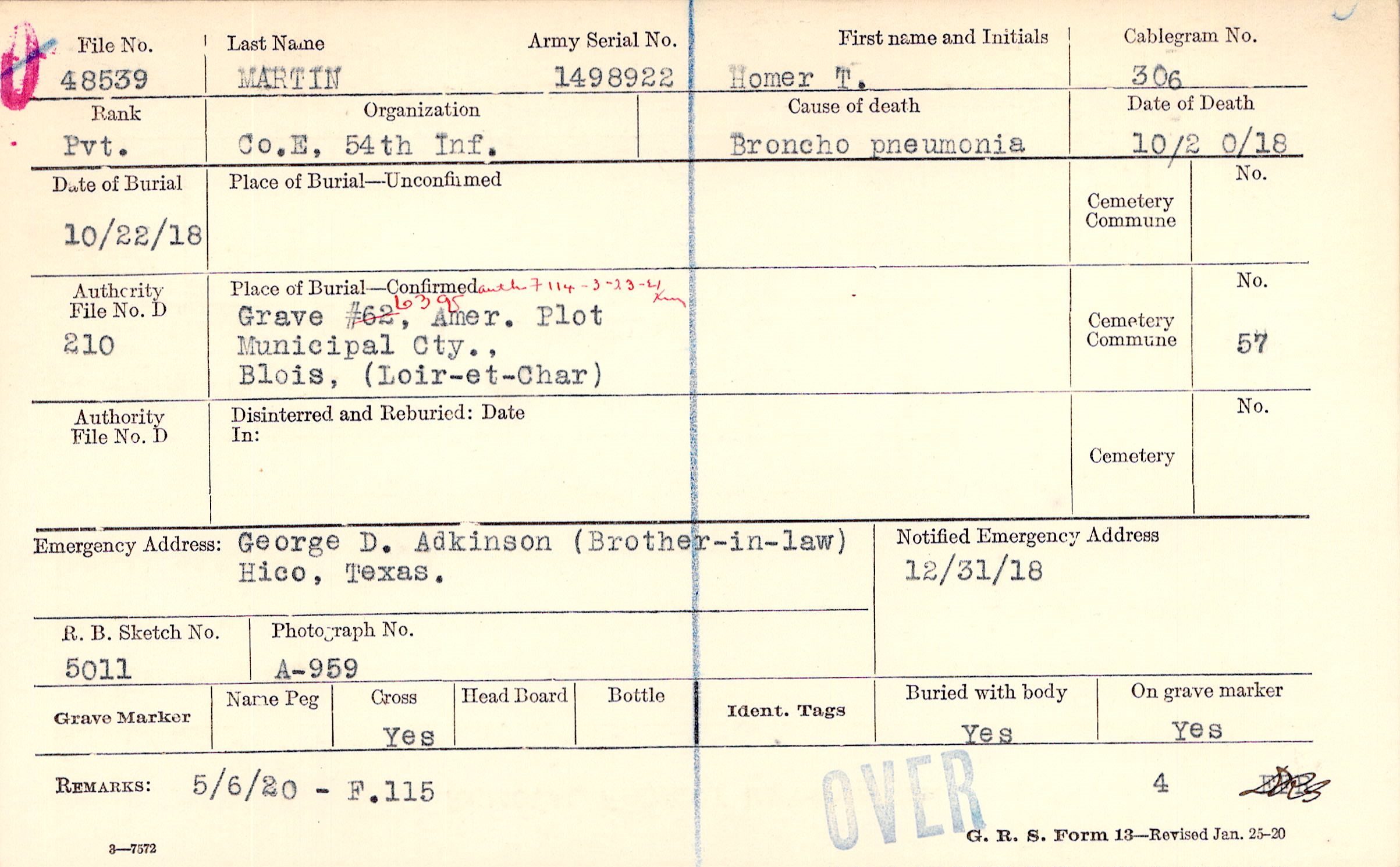 Body disinterred 10/4/1920 for preparation and shipment.