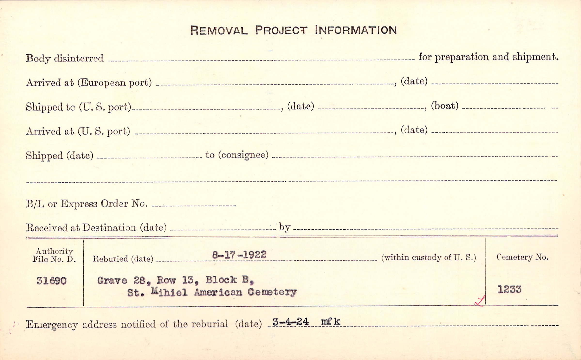 | Permanent Burial in Foreign Cemetery |