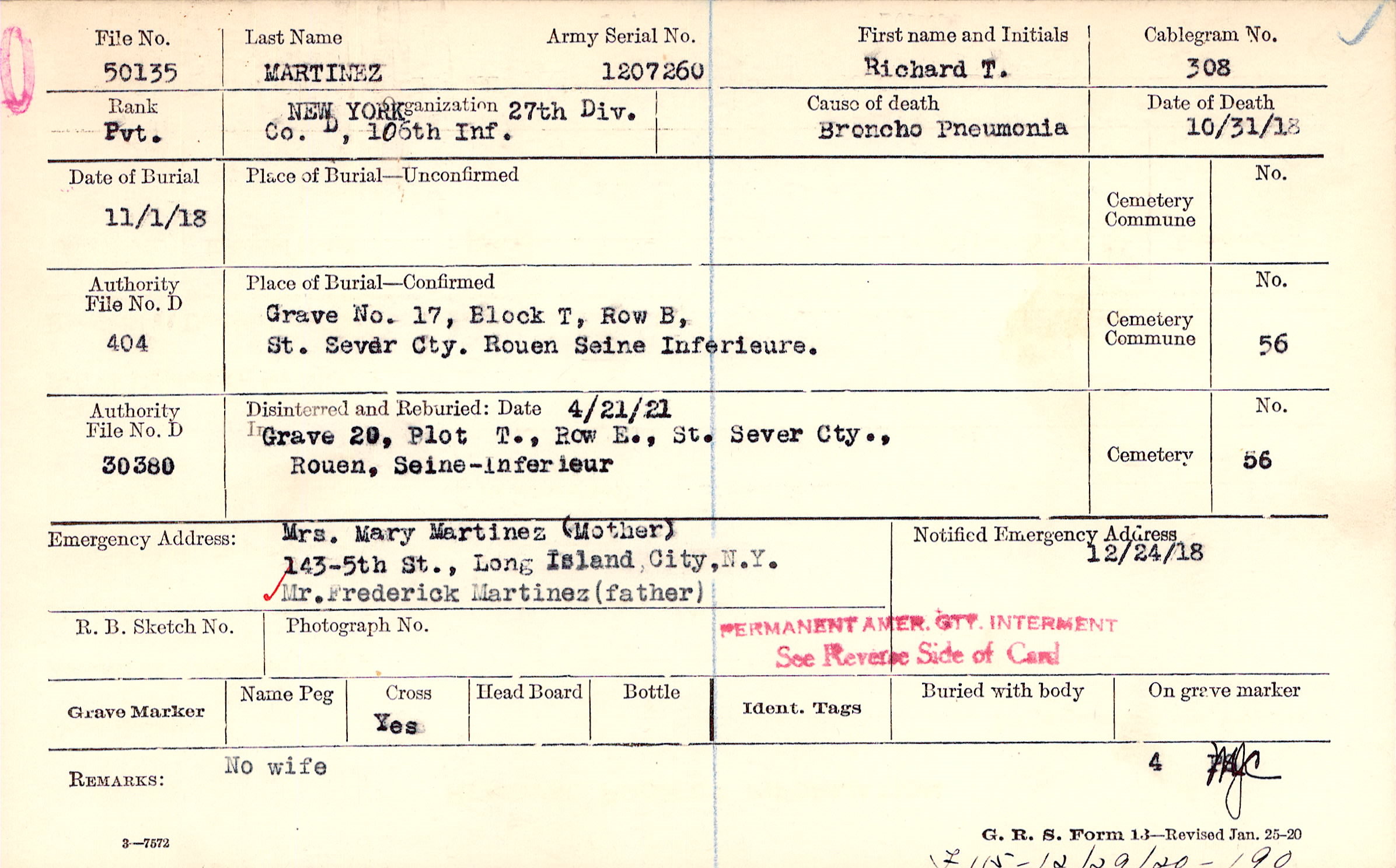 Mrs. Mary Martinez (Mother) Mr.Frederick Martinez(father), 143-5th St., Long Island, City, N.Y., Mr. Frederick Martinez (father)
