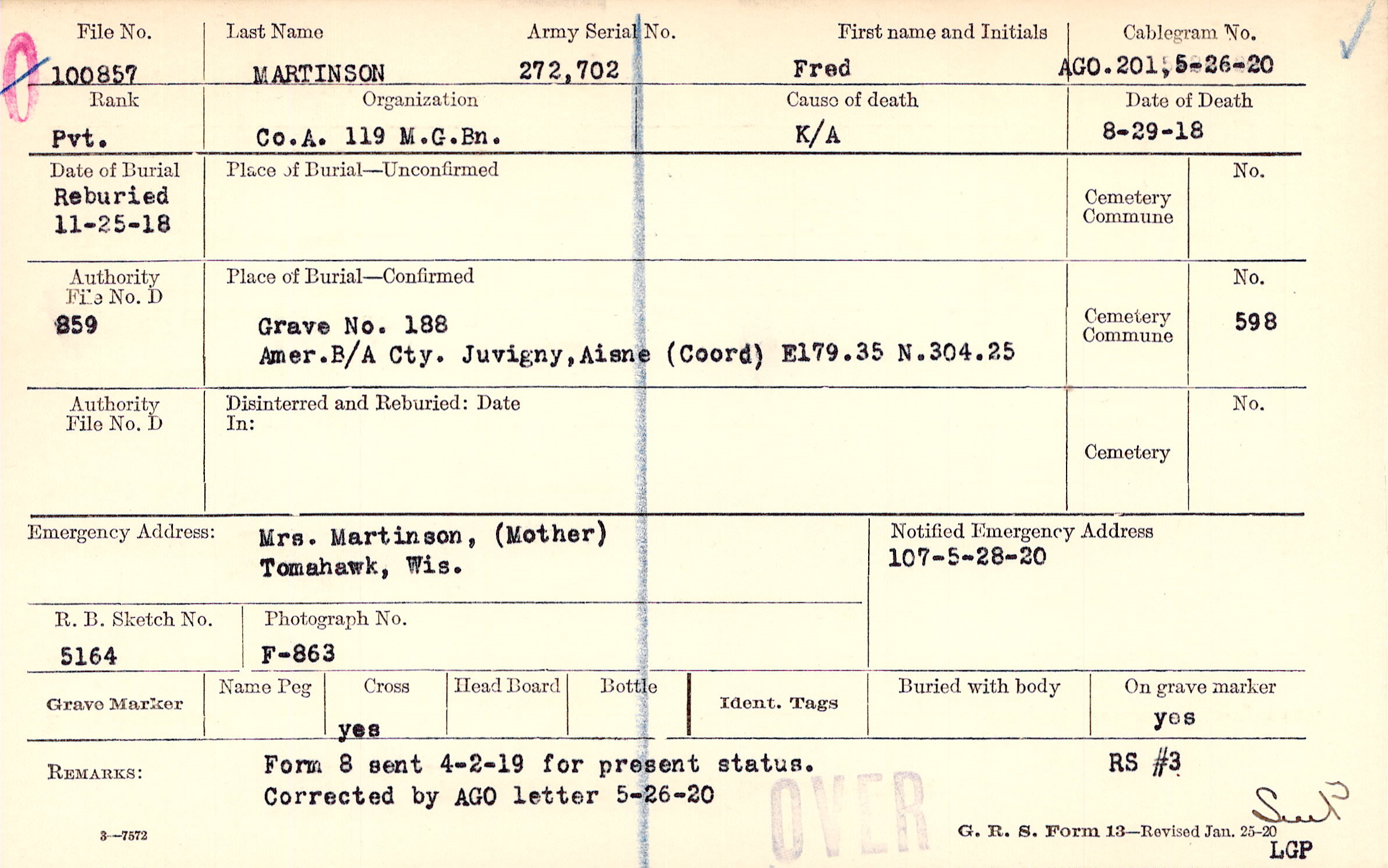 Grave 188, Amer. B/A, Cty. Juvigny, Aisne