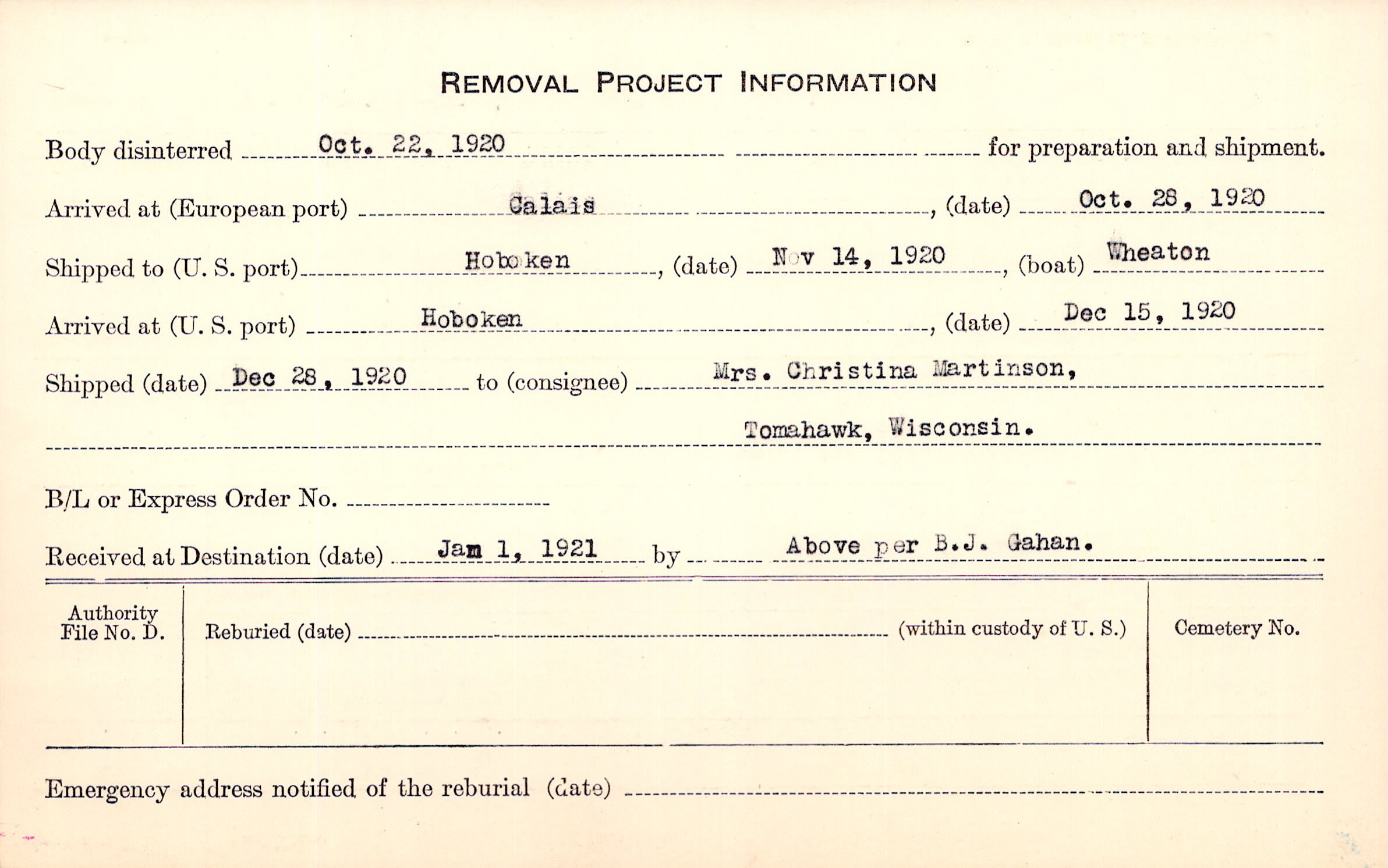 Body disinterred 10/22/1920 for preparation and shipment.