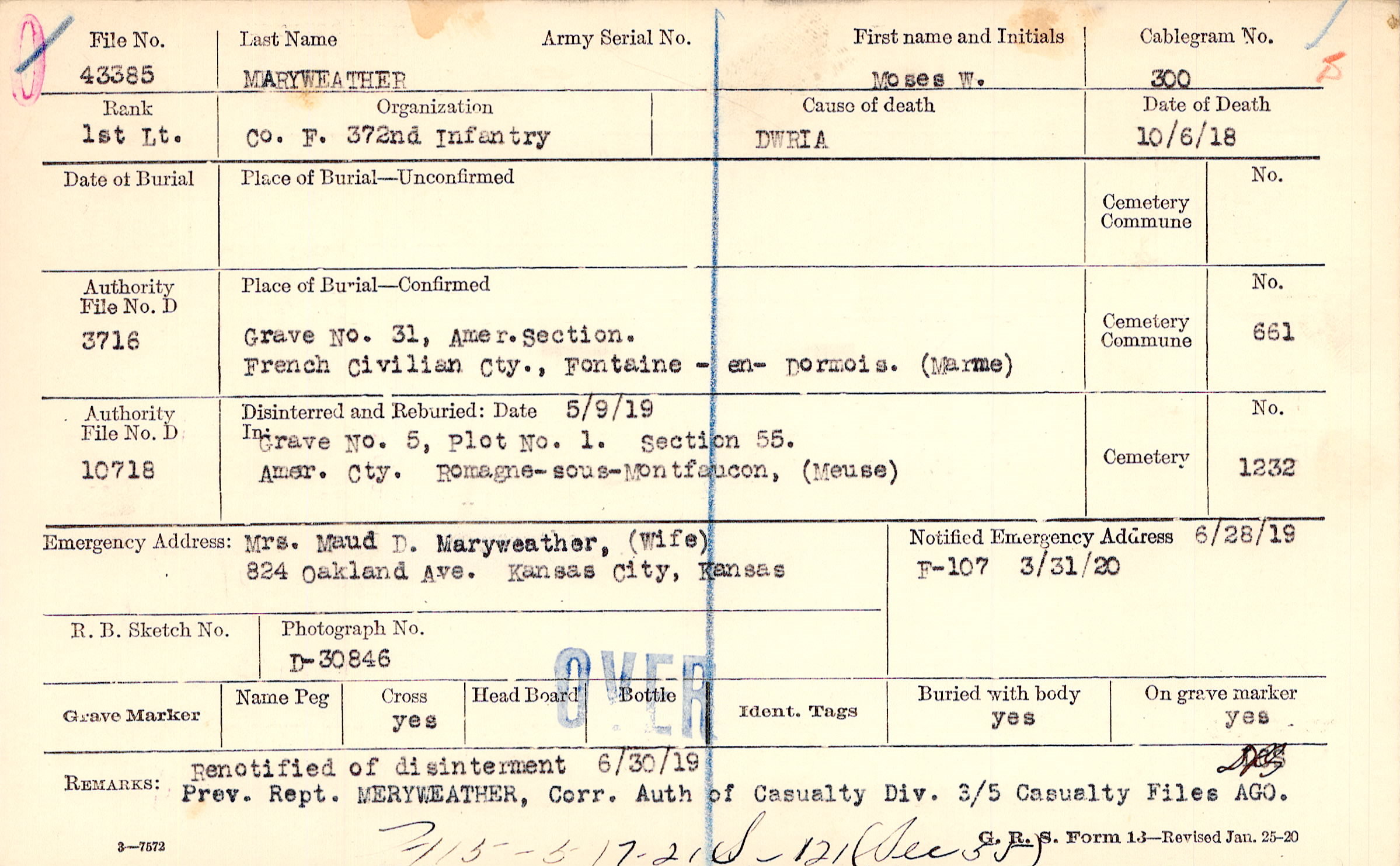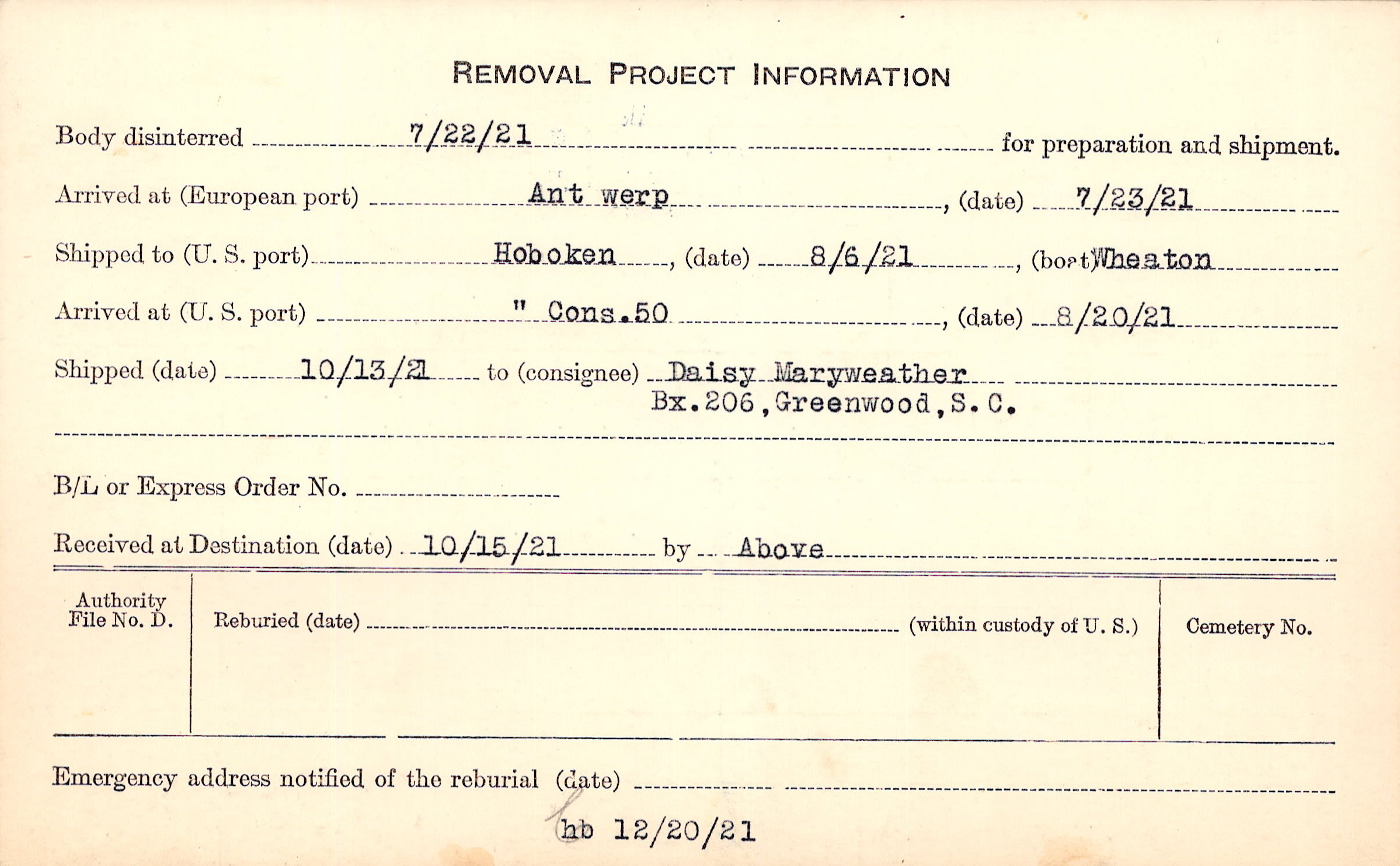Renotified of disinterment 6/30/19 Prev. Rept. MERYWEATHER, Corr. Auth of Casualty Div. 3/5 Casualty Files AGO., F115 - 5-17-21 (S-121 (Sec 55)