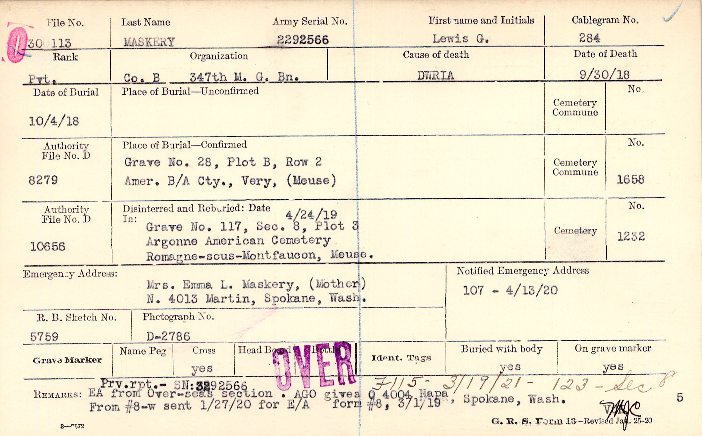 Mrs. Emma L. Maskery, (Mother), N. 4013 Martin, Spokane, Wash.