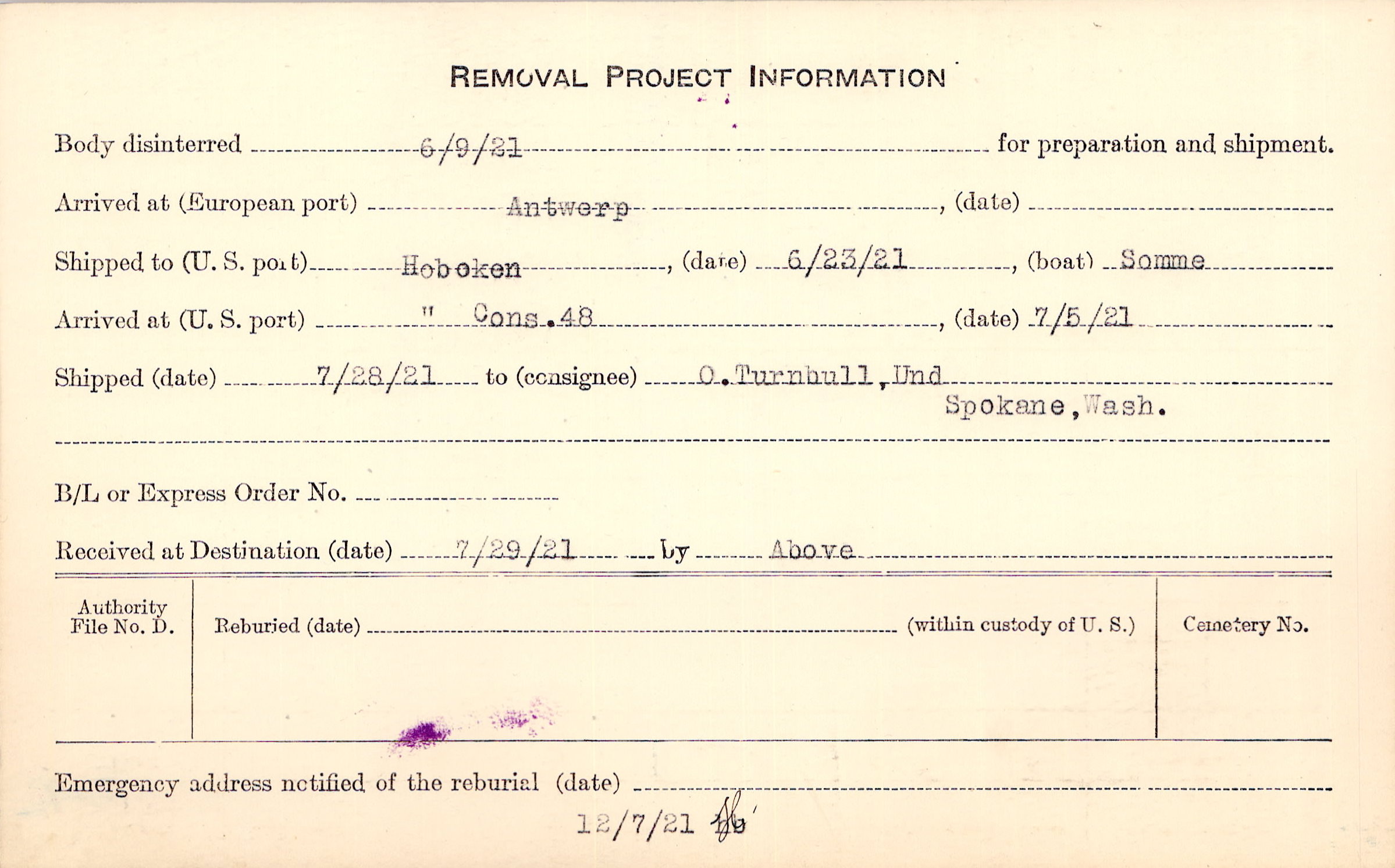 Body disinterred 6/9/1921 for preparation and shipment.