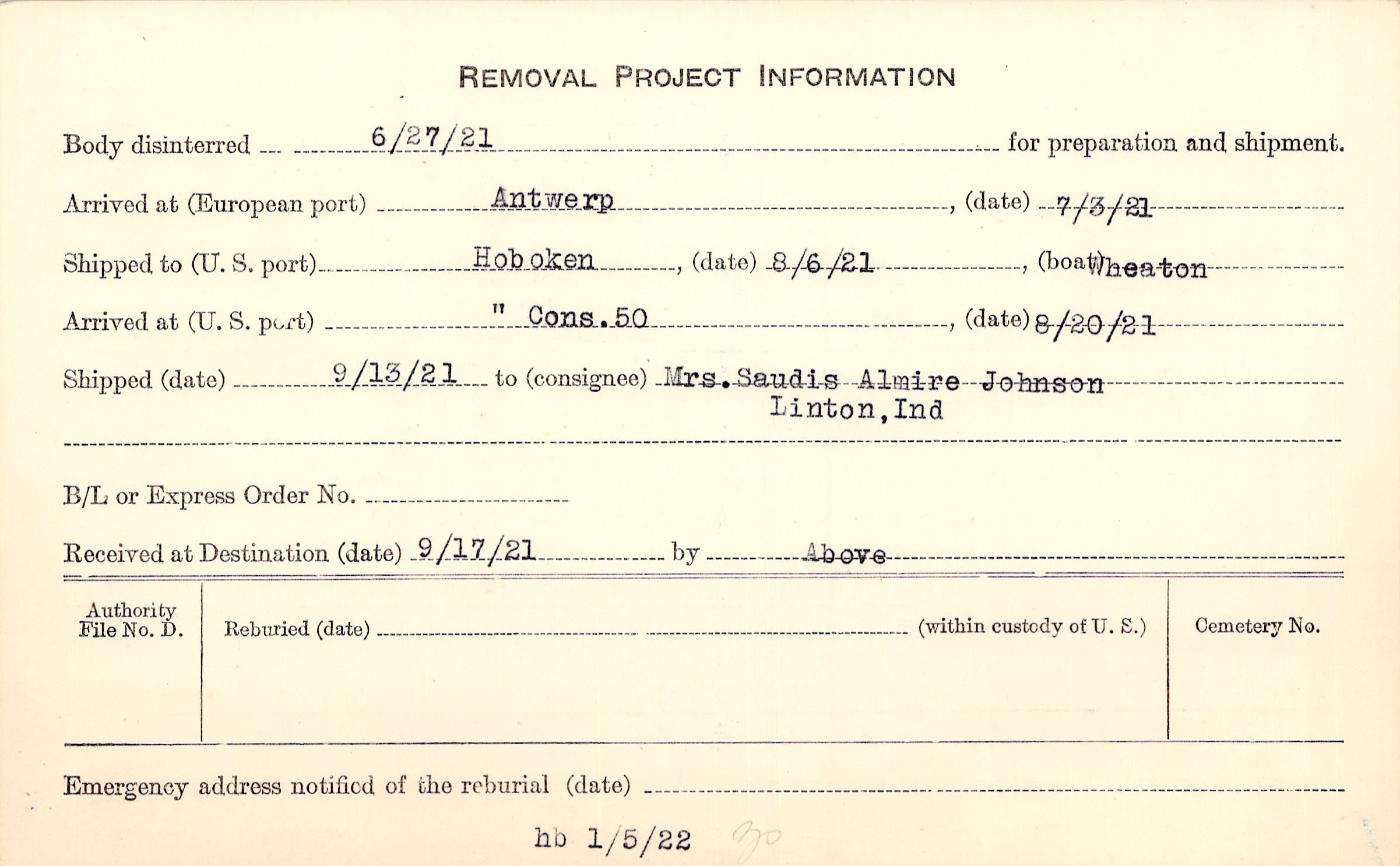 Body disinterred 6/27/1921 for preparation and shipment.