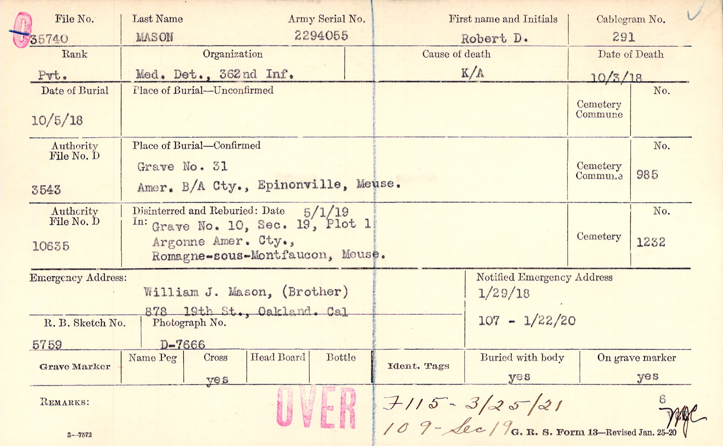 Grave 31, Amer. B/A Cty., Epinonville, Meuse.