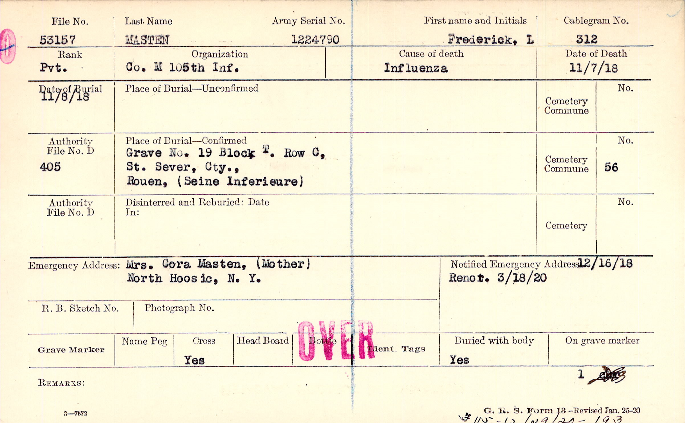 Grave 19, Block T., Row C, St. Sever, Cty., Rouen, Seine Inferieure