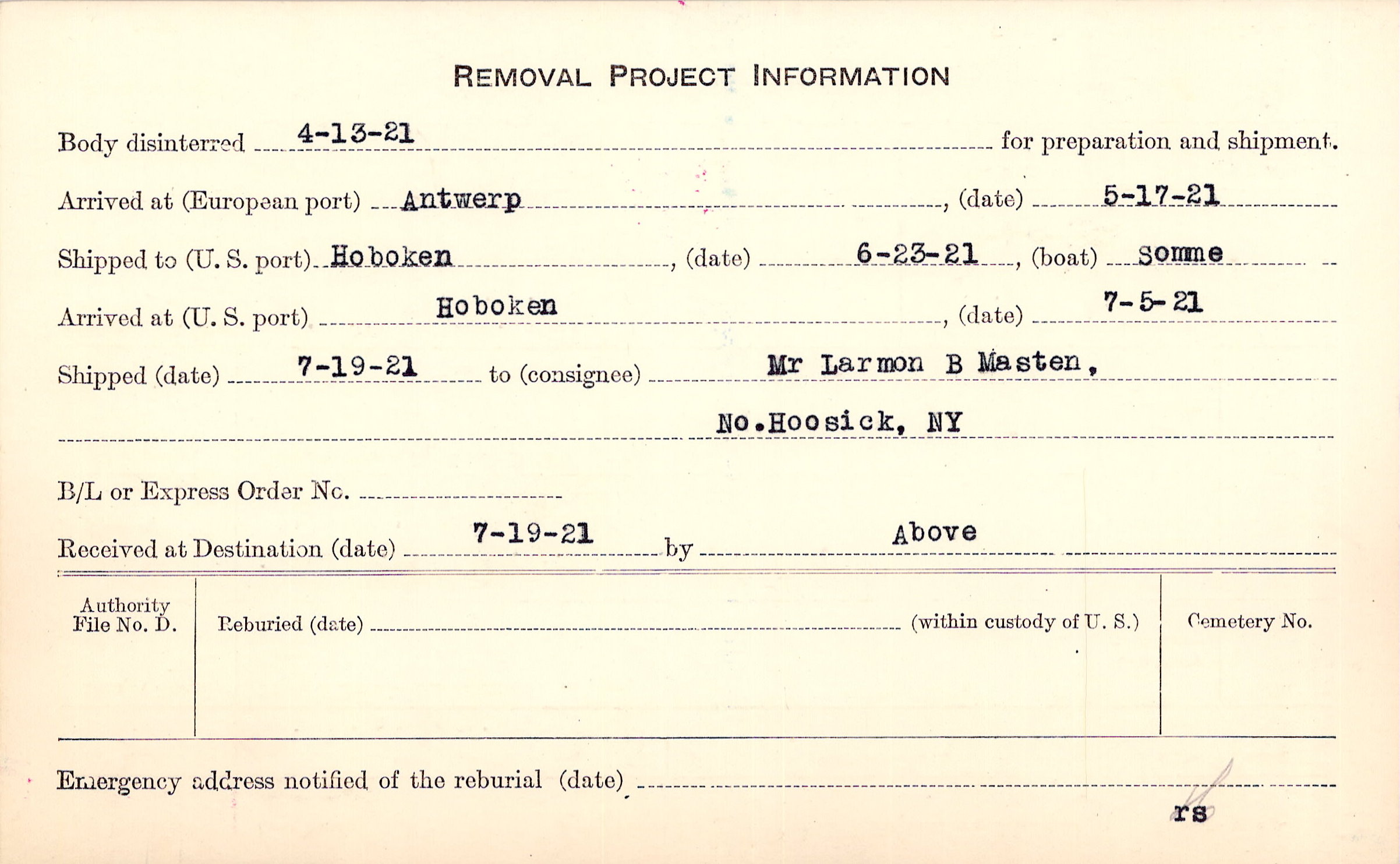 Body disinterred 4/13/1921 for preparation and shipment.