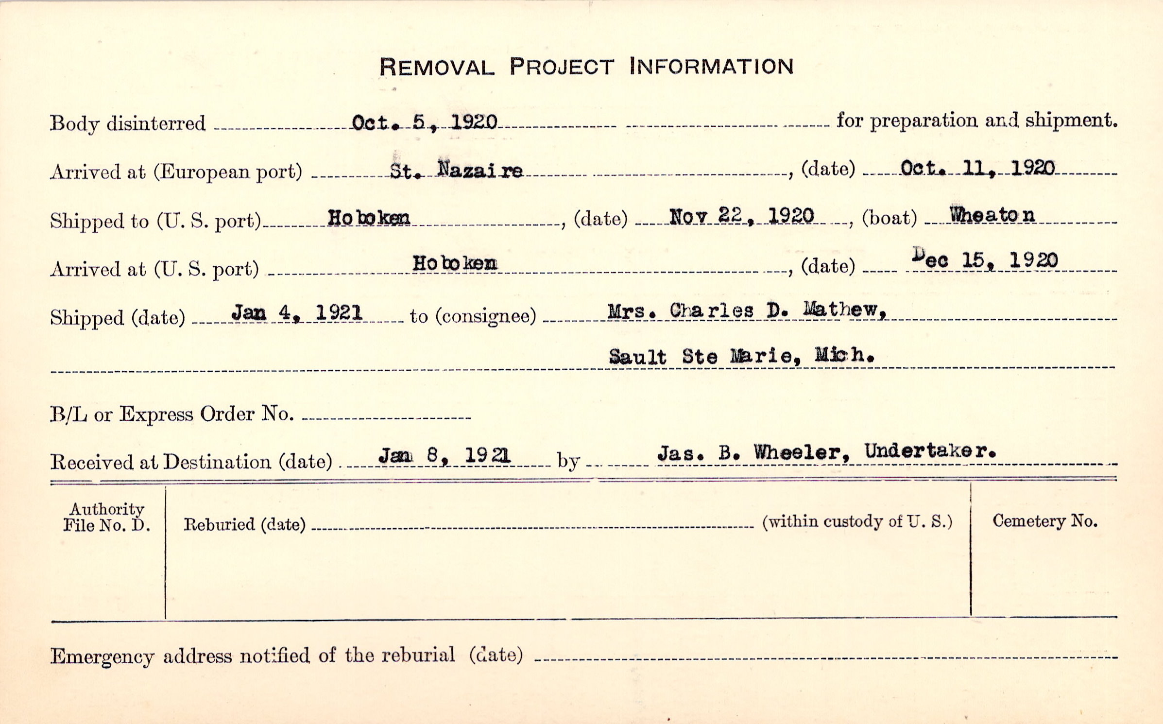Body disinterred 10/5/1920 for preparation and shipment.