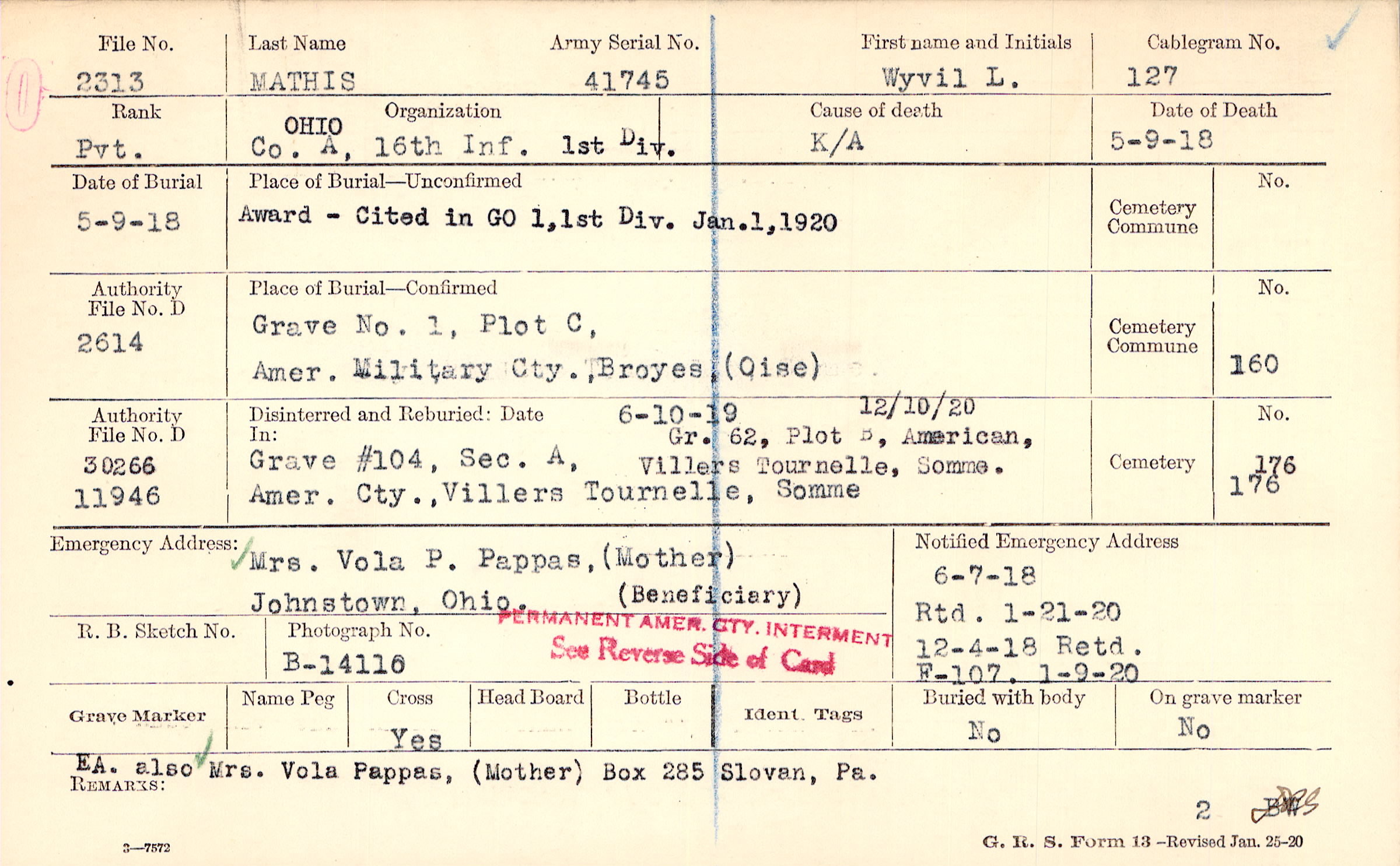 Mrs. Vola P. Pappas, (Mother), Johnstown, Ohio., (Beneficiary)