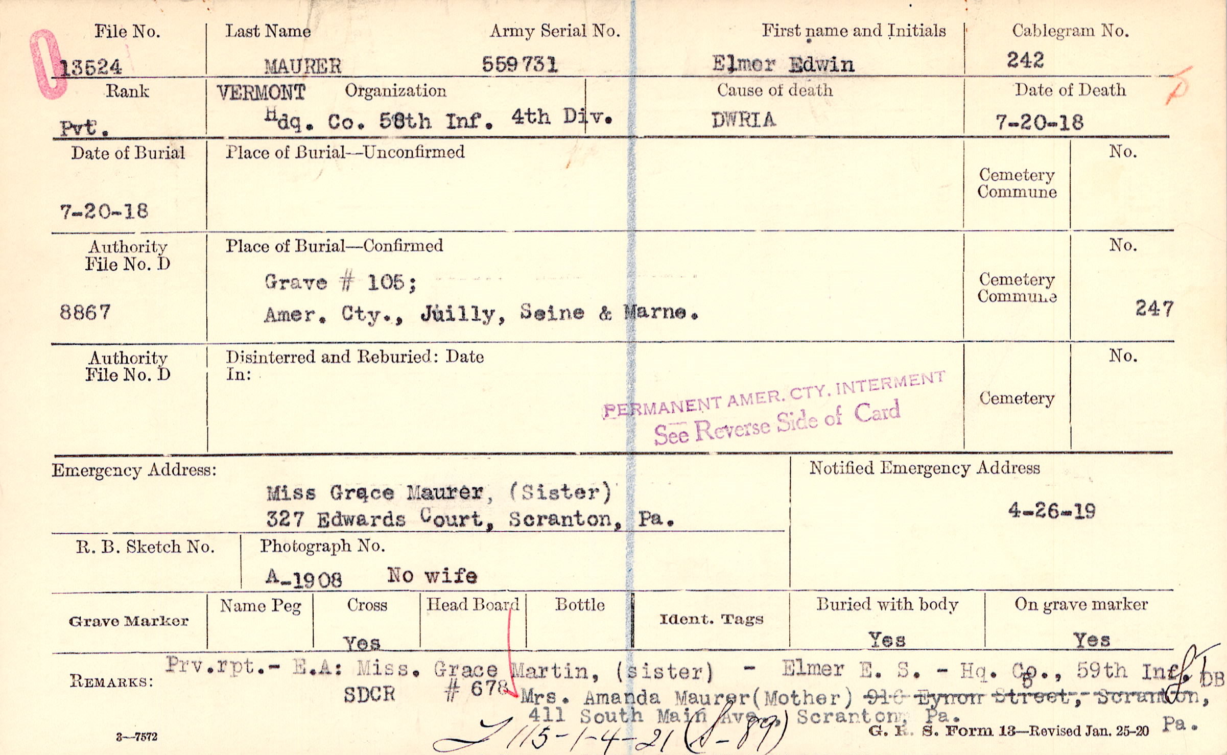 Prv. rpt.- E.A: Miss. Grace Martin, (sister) - Elmer E. S. - Hq. Co., 59th Inf. Mrs. Amanda Maurer (Mother) 411 South Main Ave., Scranton, Pa., F115-1-4-21 (S_89), SDCR # 678
