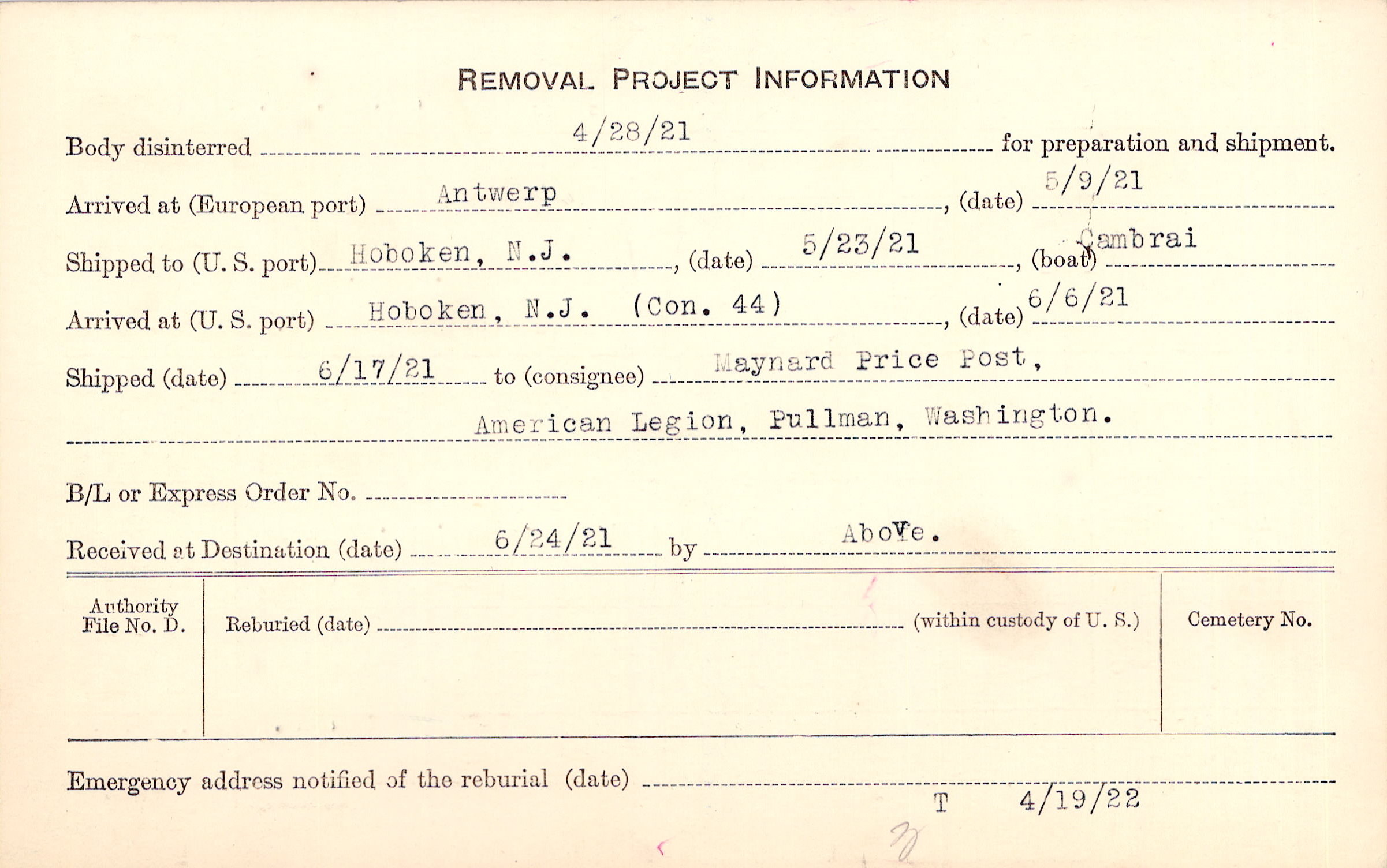 to Maynard Price Post, American Legion, Pullman, Washington.