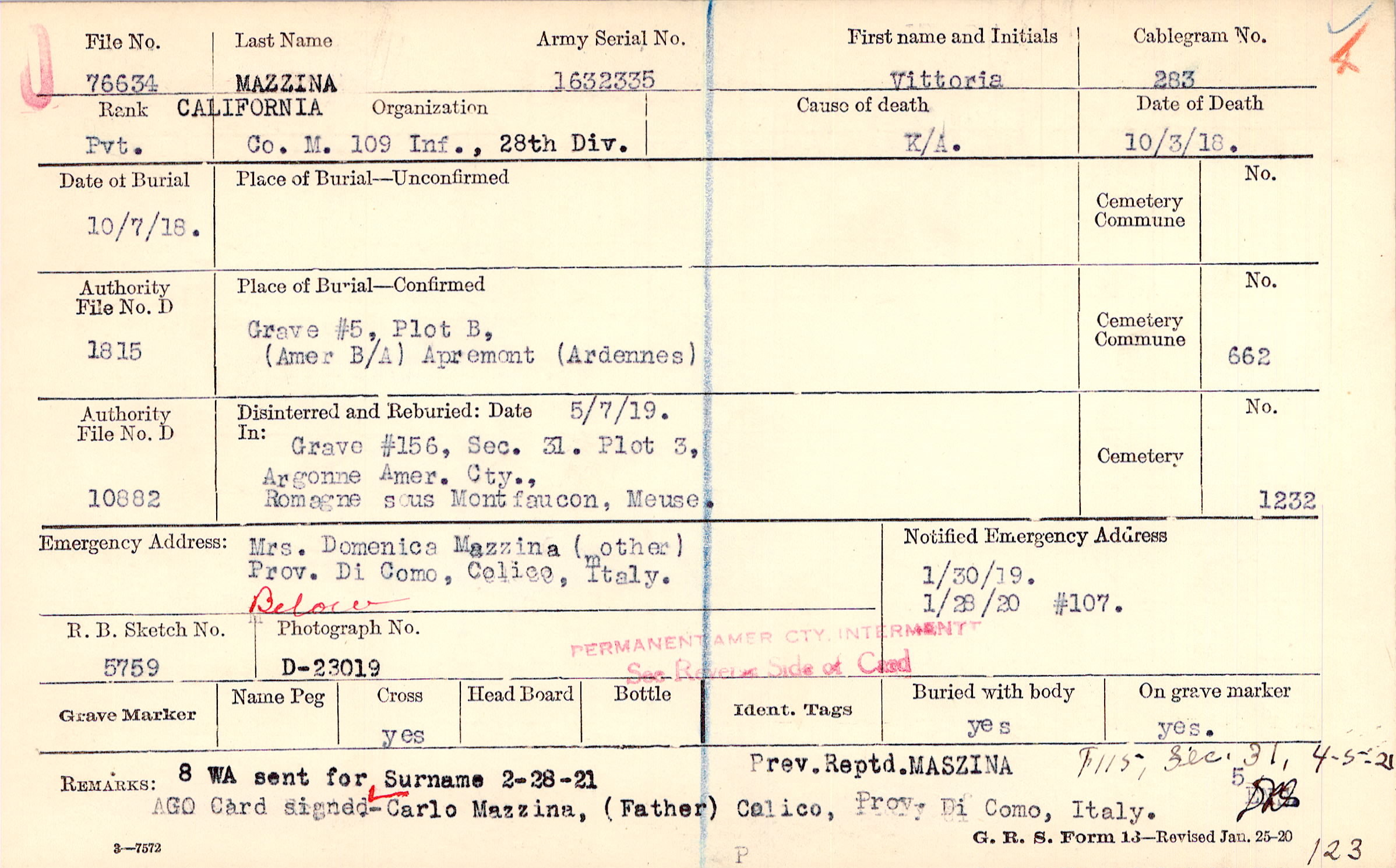 8 WA sent for Surname 2-28-21 Prev. Reptd. MASZINA, F115, Sec. 31. 4-5-21 123