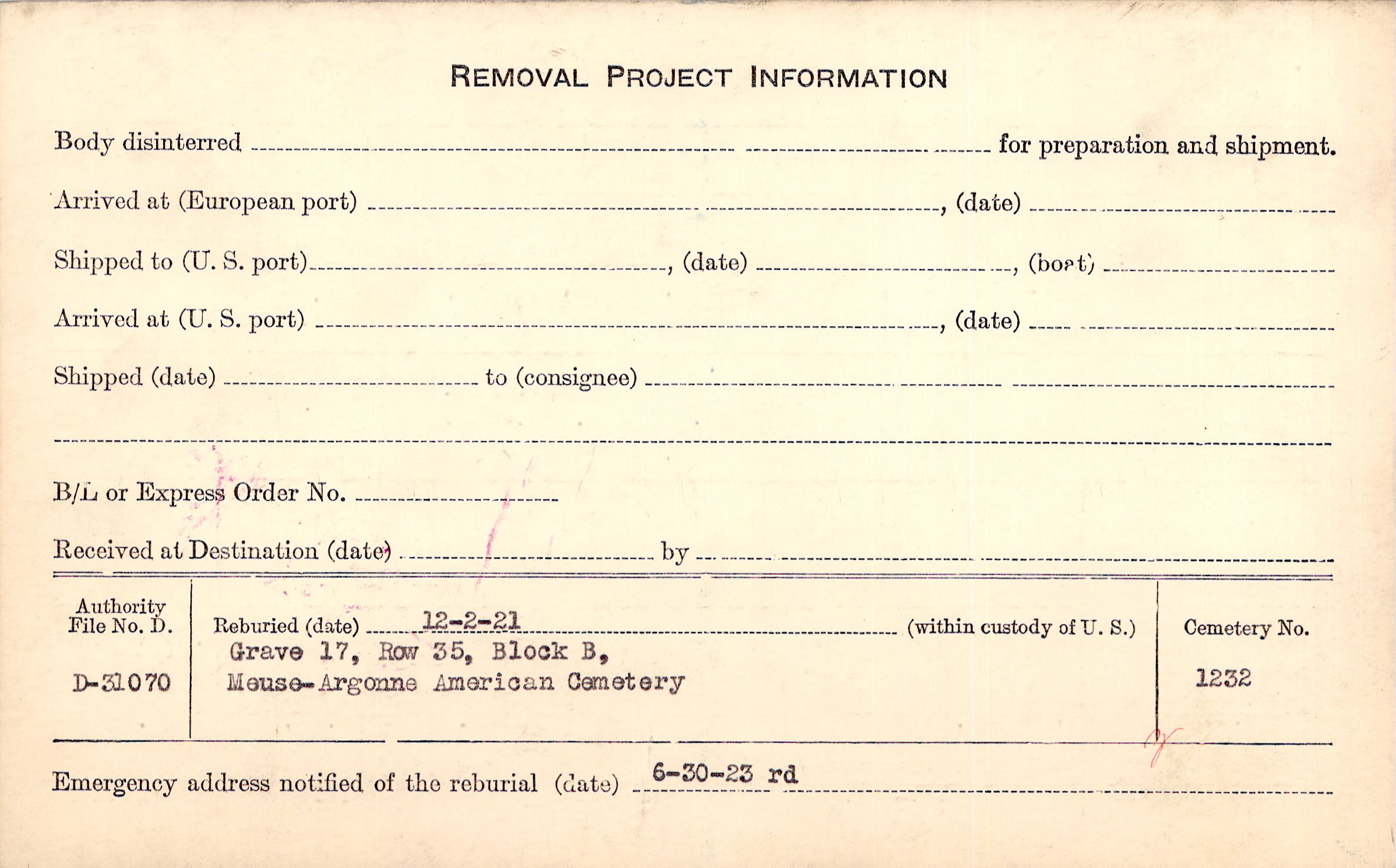 | Permanent Burial in Foreign Cemetery |