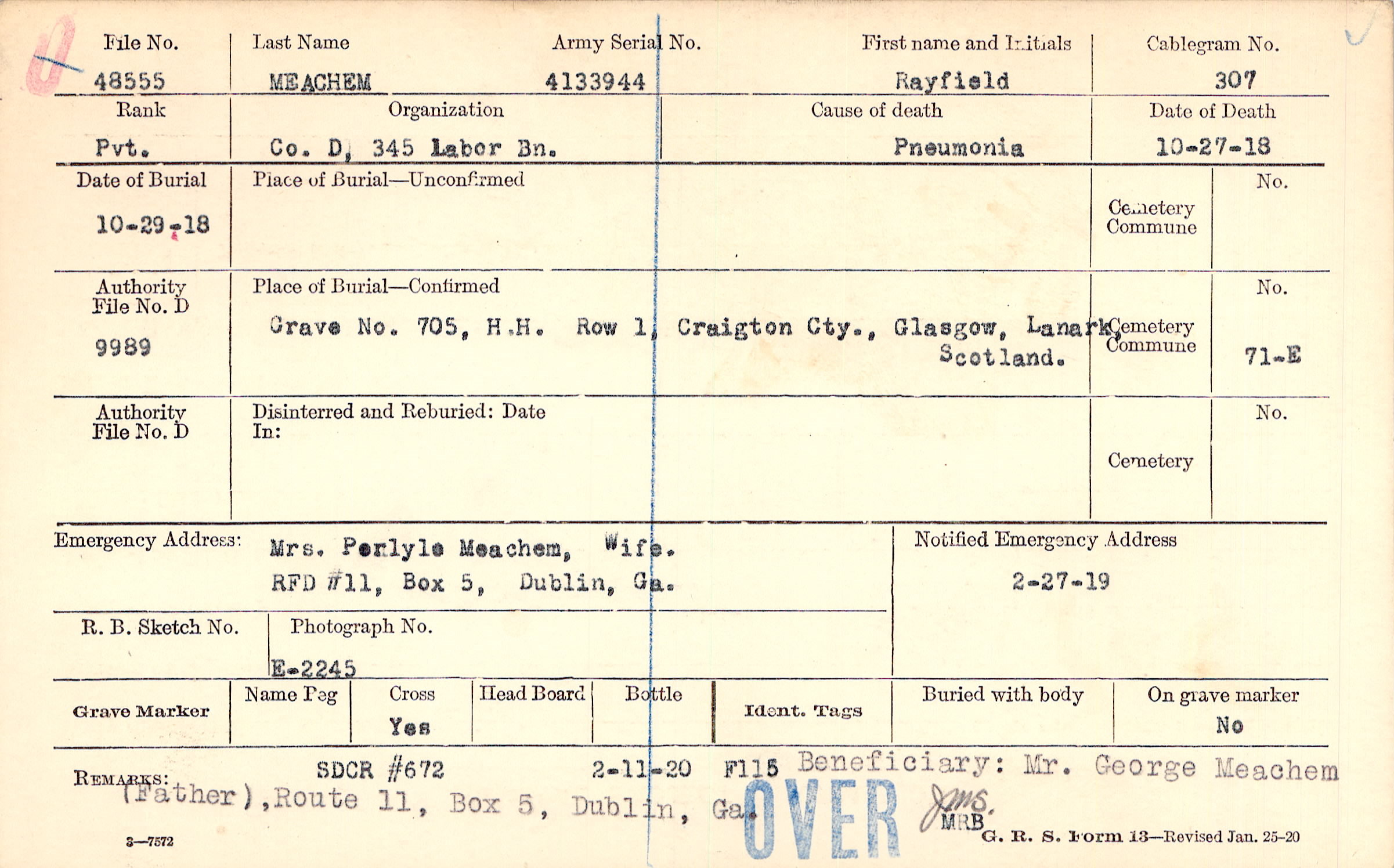Mrs. Perlyle Meachem, Wife., RFD #11, Box 5, Dublin, Ga.