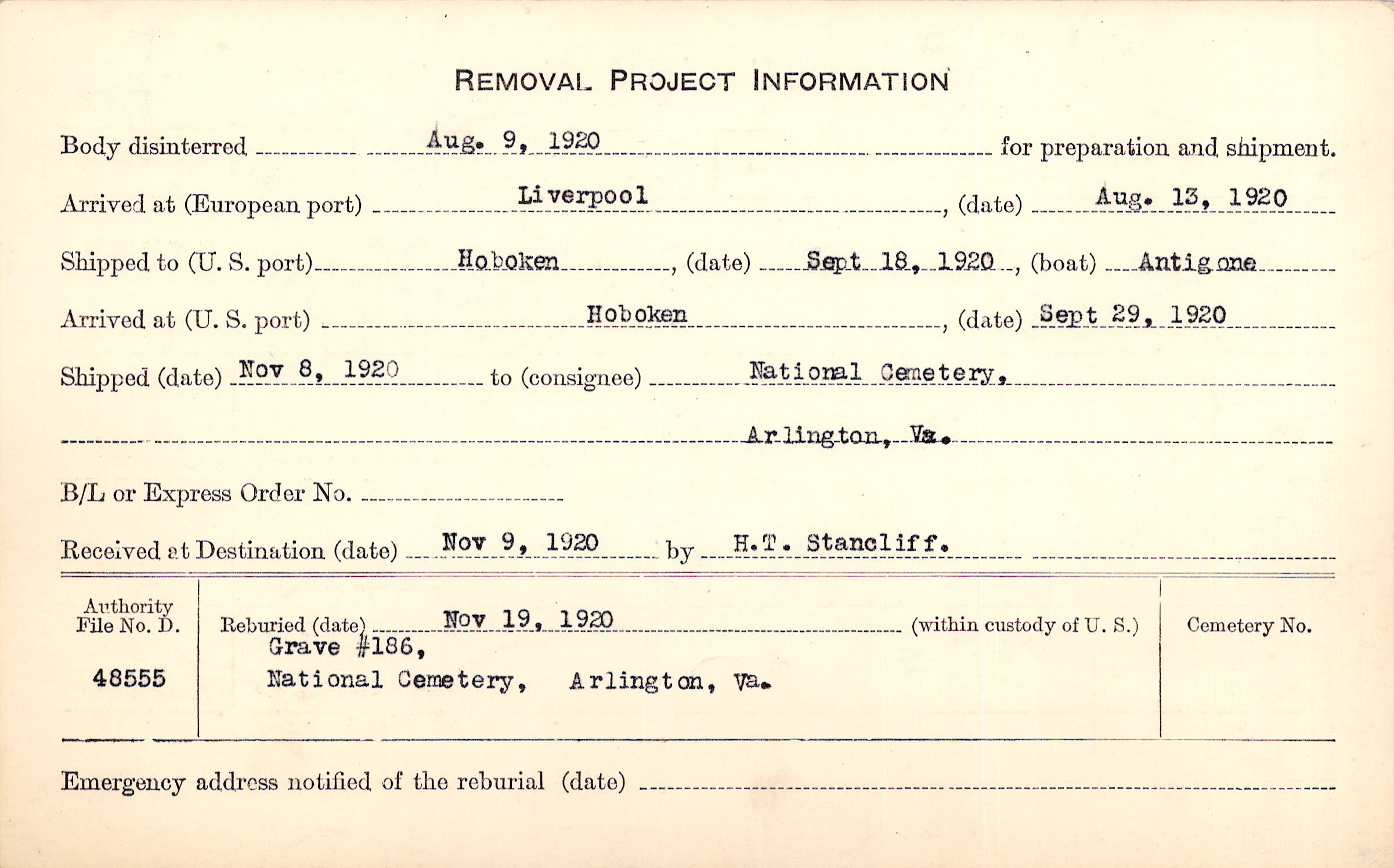 Body disinterred 8/9/1920 for preparation and shipment.