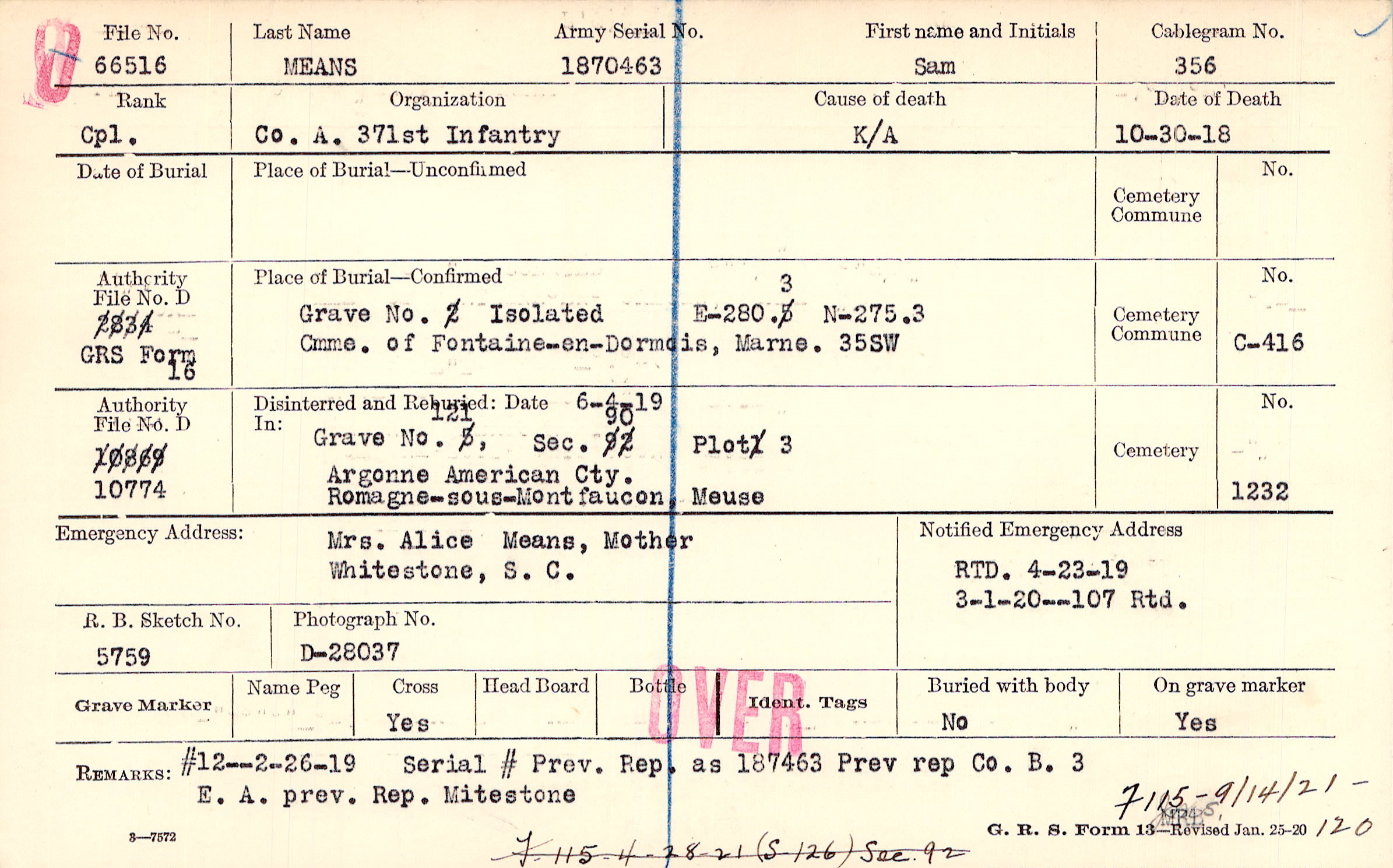Grave 121, Section 90, Plot 3, Argonne American Cemetery, Romagne-sous-Montfaucon, Meuse