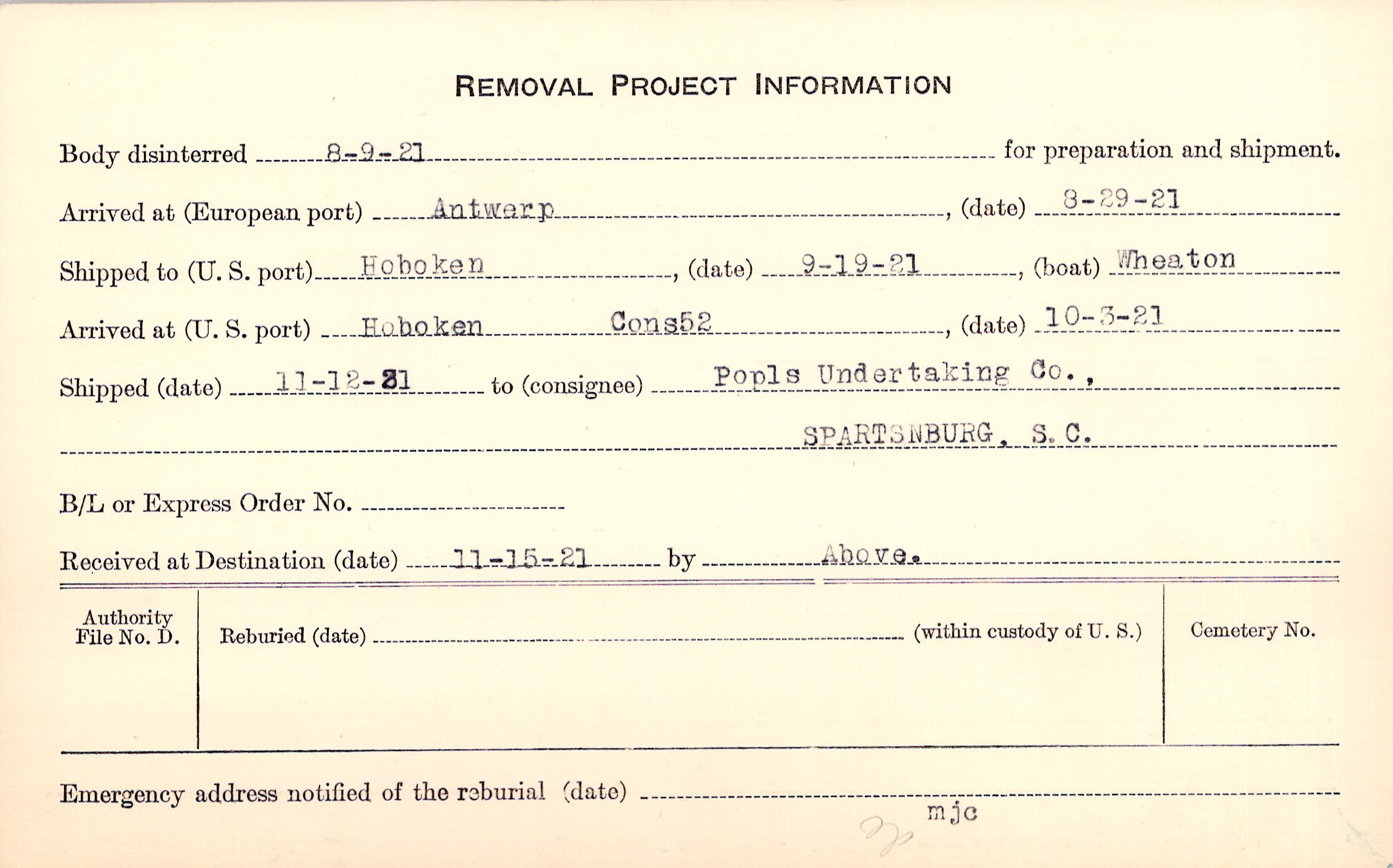 Body disinterred 8/9/1921 for preparation and shipment.