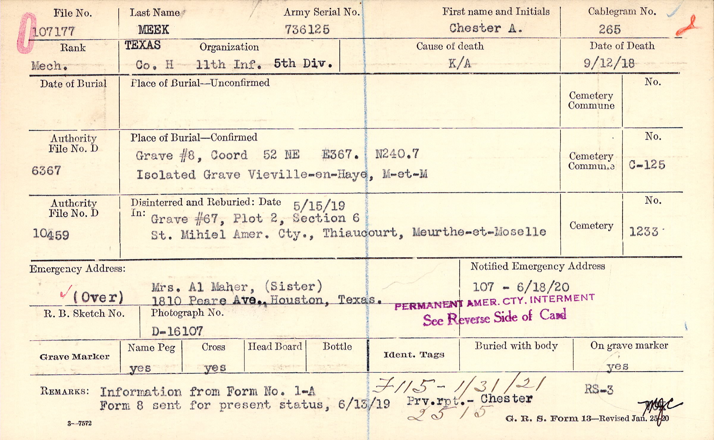 Grave 67, Section 6, Plot 2, St. Mihiel American Cemetery, Thiaucourt, Meurthe-et-Moselle