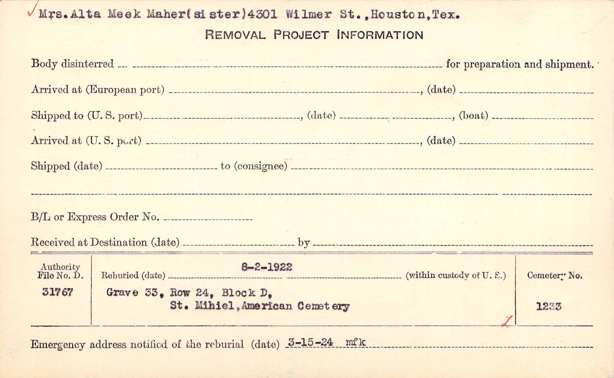 Mrs. Al Maher, (Sister), 1810 Peare Ave., Houston, Texas., (Over)