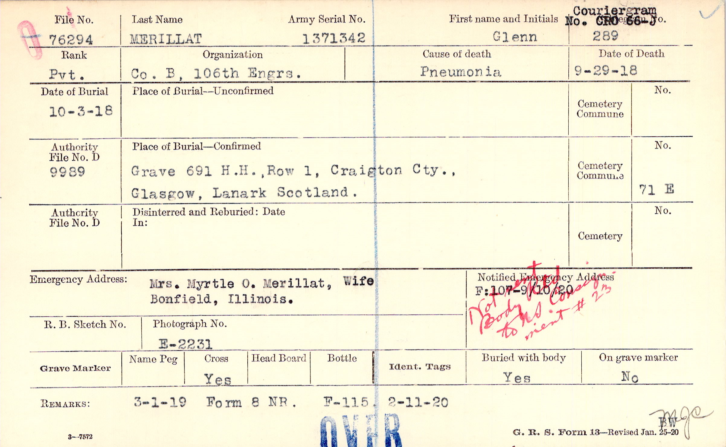 Mrs. Myrtle O. Merillat, Wife, Bonfield, Illinois., Not sent Body Rtd to NS. Consignment #23