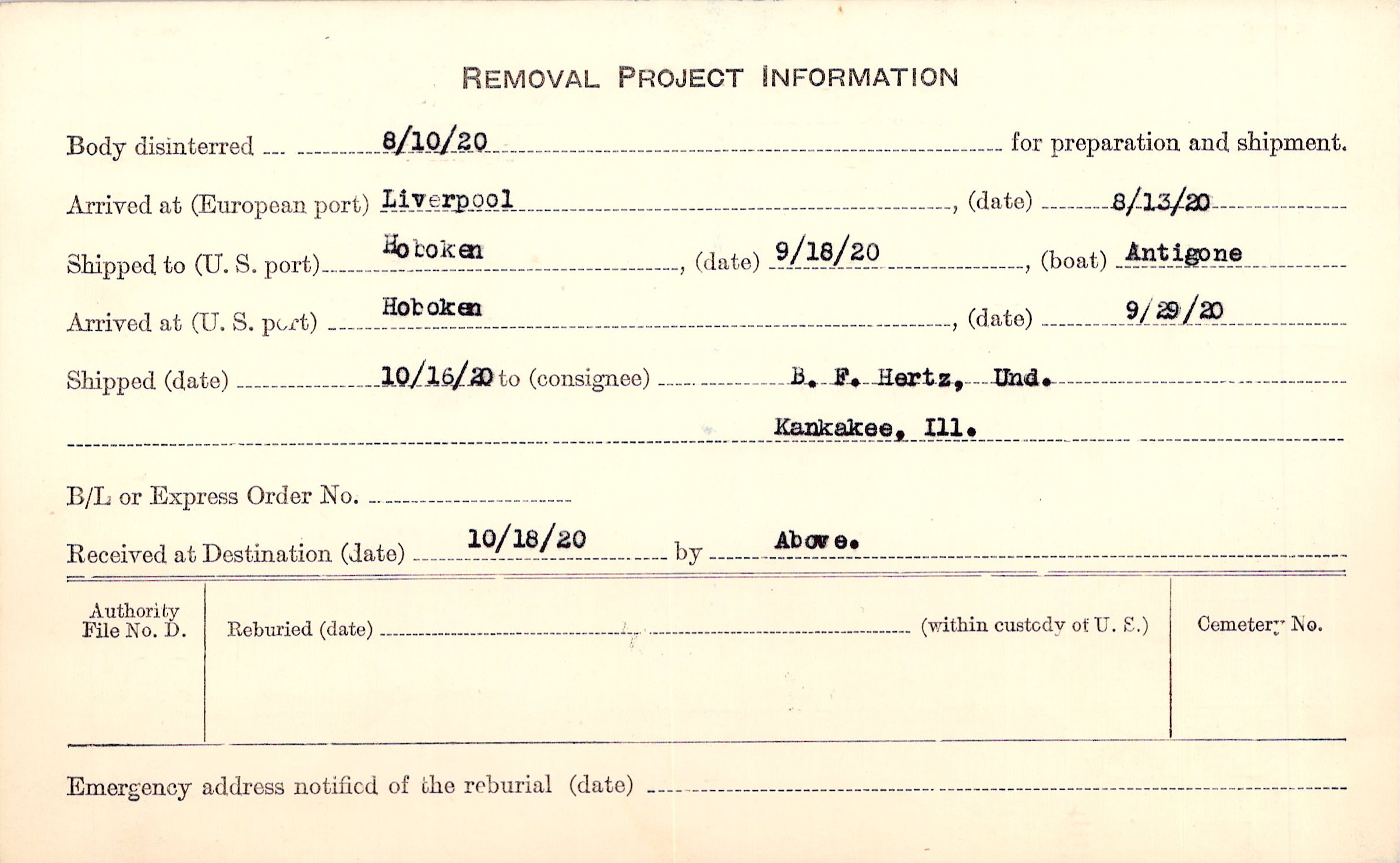 Body disinterred 8/10/1920 for preparation and shipment.