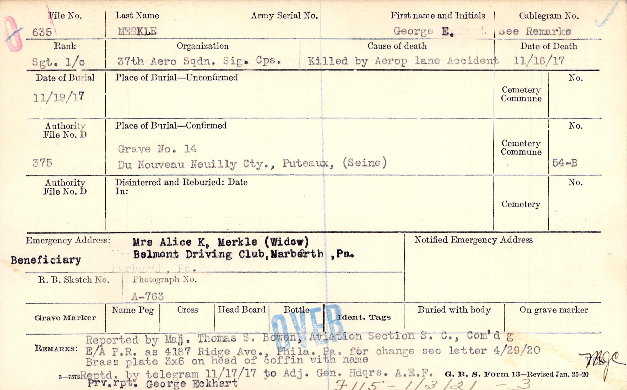 Reported by Maj. Thomas S. Bowen, Aviation Section S. C., Com'd g E/A P.R. as 4187 Ridge Ave., Phila. Pa. for change see letter 4/29/20 Brass plate 3x6 on head of coffin with name Reptd. by telegram 11/17/17 to Adj. Gen. Hdqrs. A. E.F. Prv. rpt. George Eckhart, F115 - 1/3/21 - 3