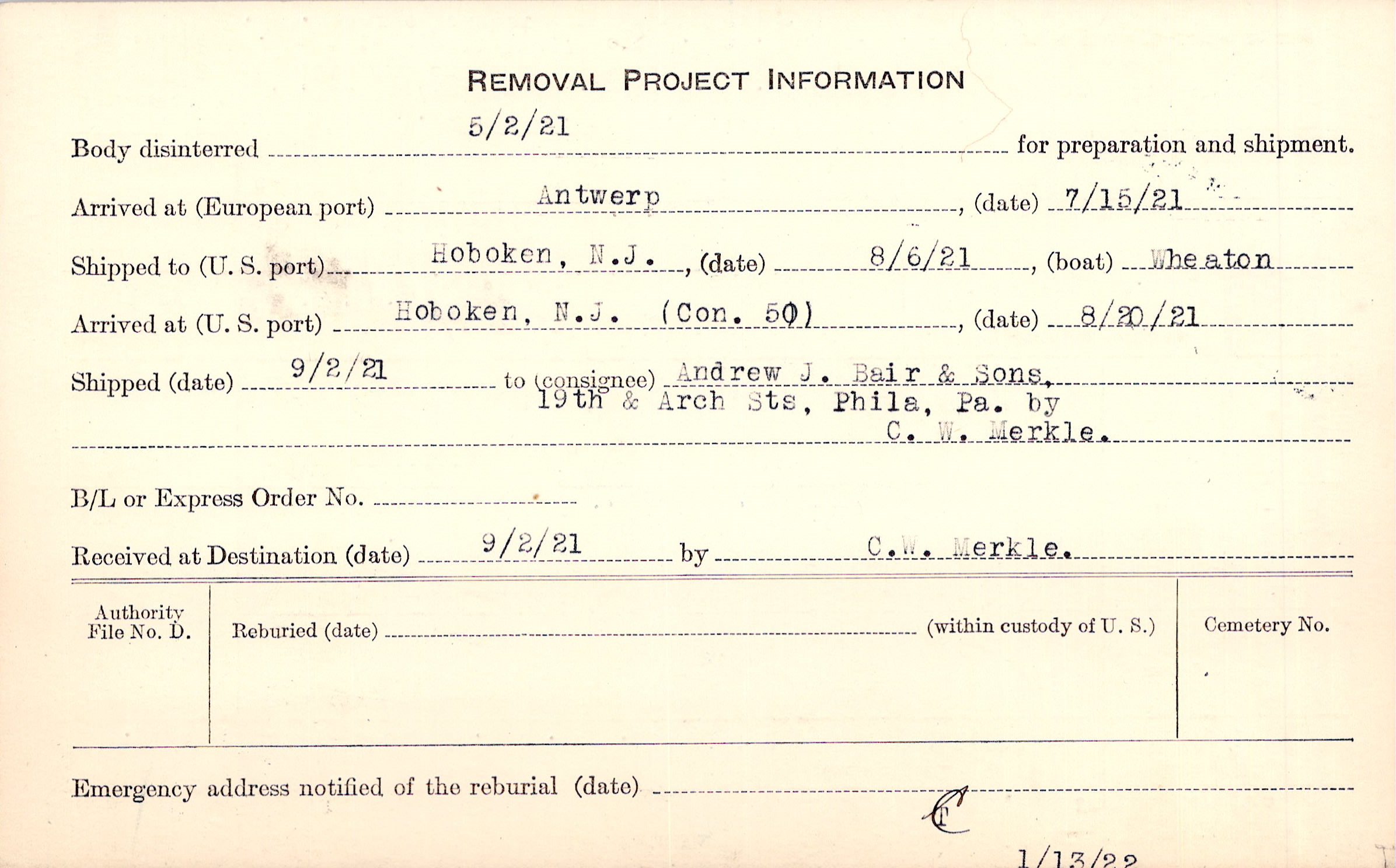 to Andrew J. Bair & Sons, 19th & Arch Sts, Phila, Pa. by C. W. Merkle.