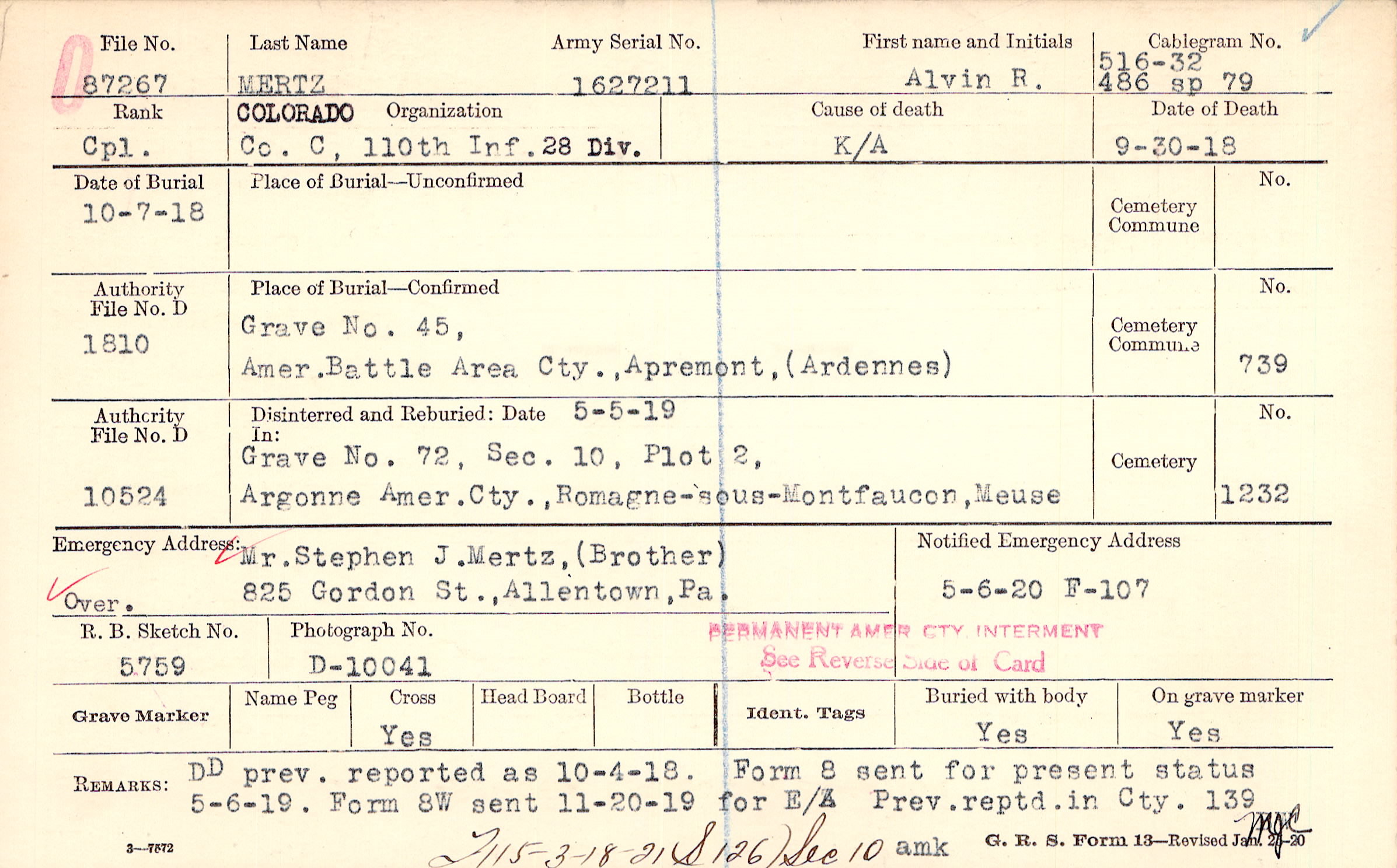 Mr.Stephen J.Mertz,(Brother), 825 Gordon St.,Allentown,Pa., Over.