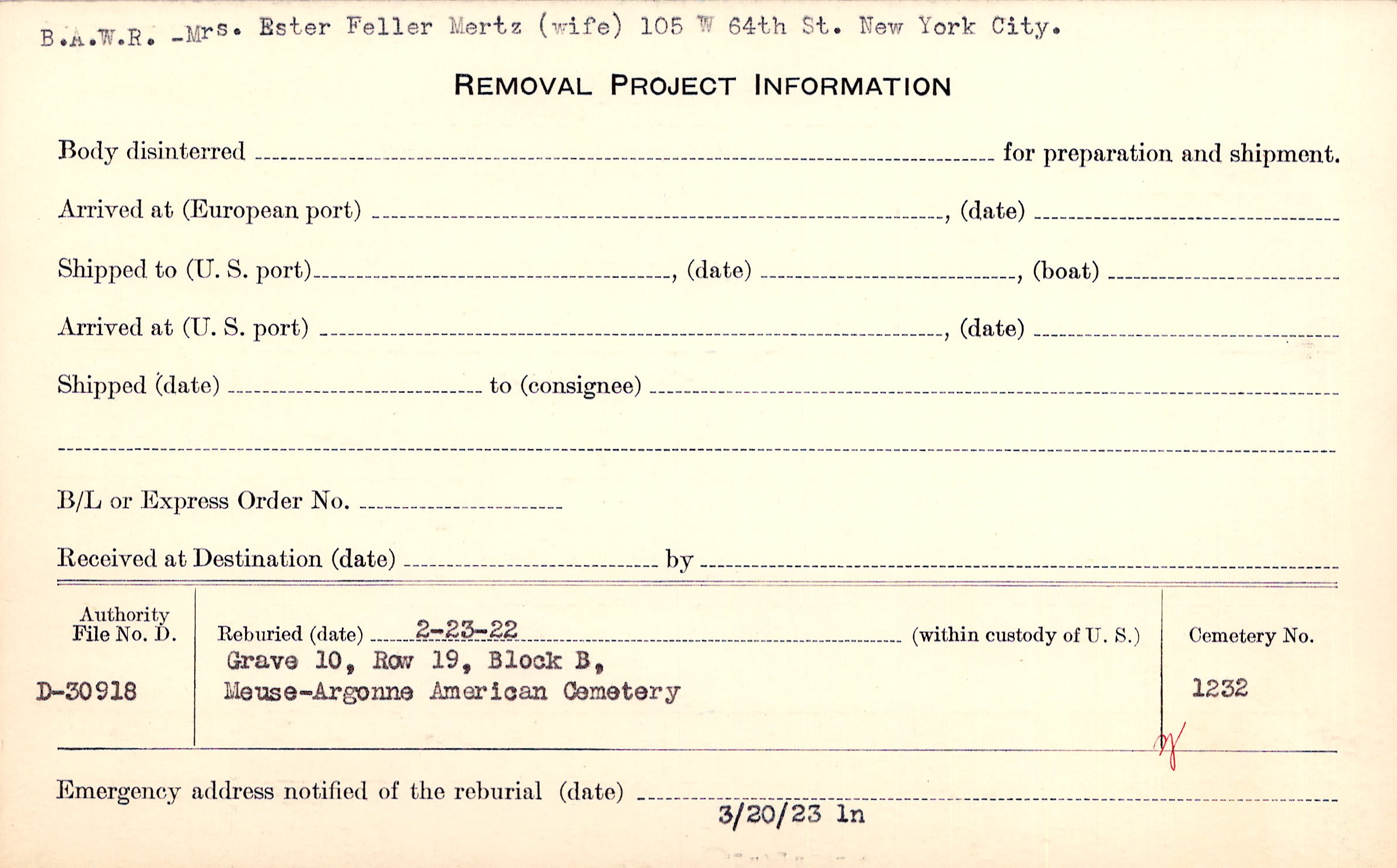 B.A.W.R. - Mrs. Ester Feller Mertz (wife) 105 W 64th St. New York City. |