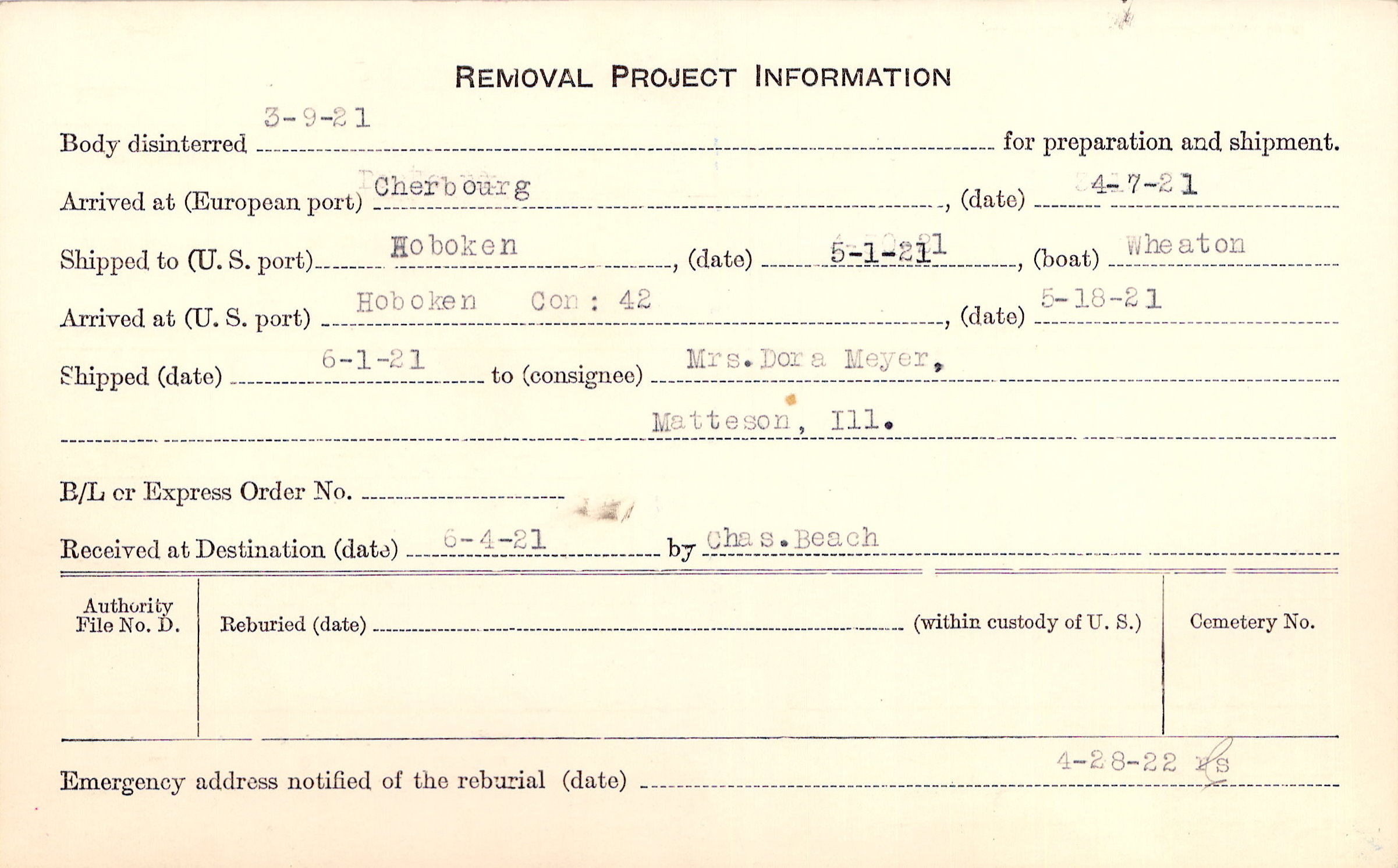 Body disinterred 3/9/1921 for preparation and shipment.