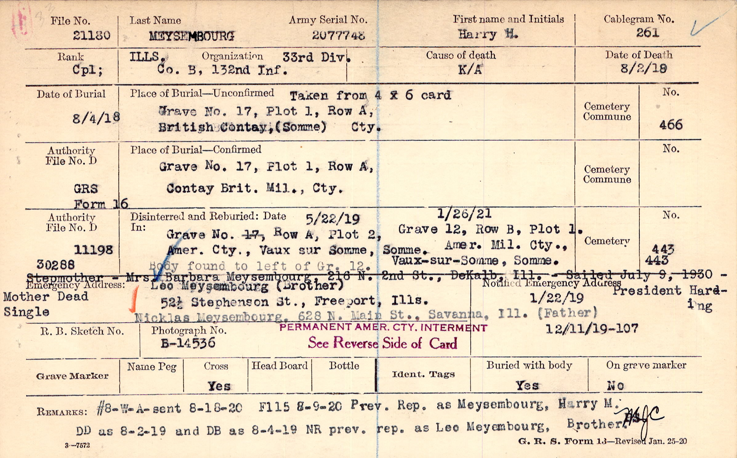 Leo Meysembourg (brother), 52 stephenson st., freeport ills., mother dead single stephmother - mrs barbara meysembourg, 216 n 2nd st, dekalb, ill. - sailed july 9, 1930 - president harding nicklas meysembourg, 628 n main st, savanna, ill (father)