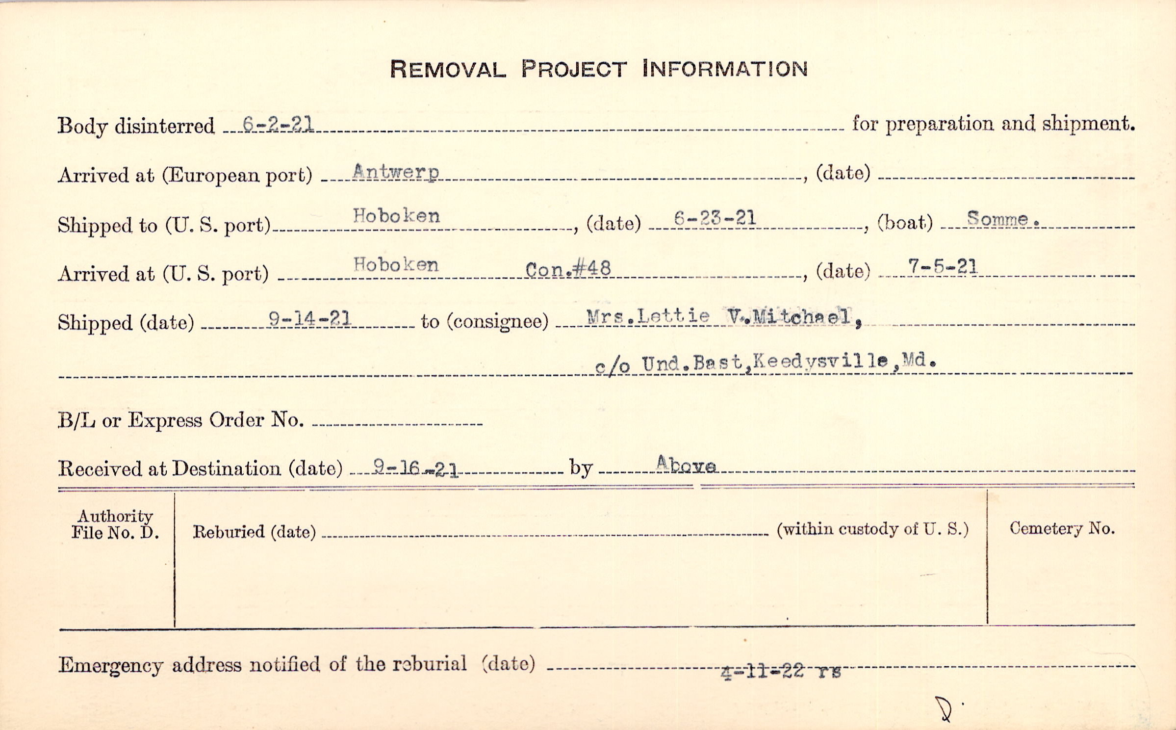 to Mrs. Lettie V. Mitchael, c/o Und. Bast, Keedysville, Md.