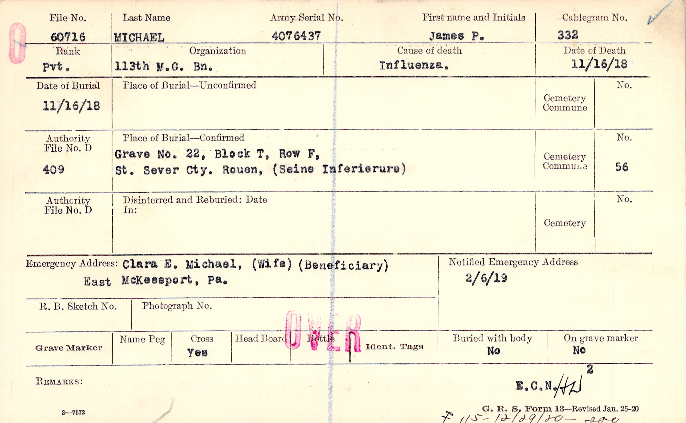 Grave 22, Block T, Row F, St. Sever Cty., Rouen, (Seine Inferierure)