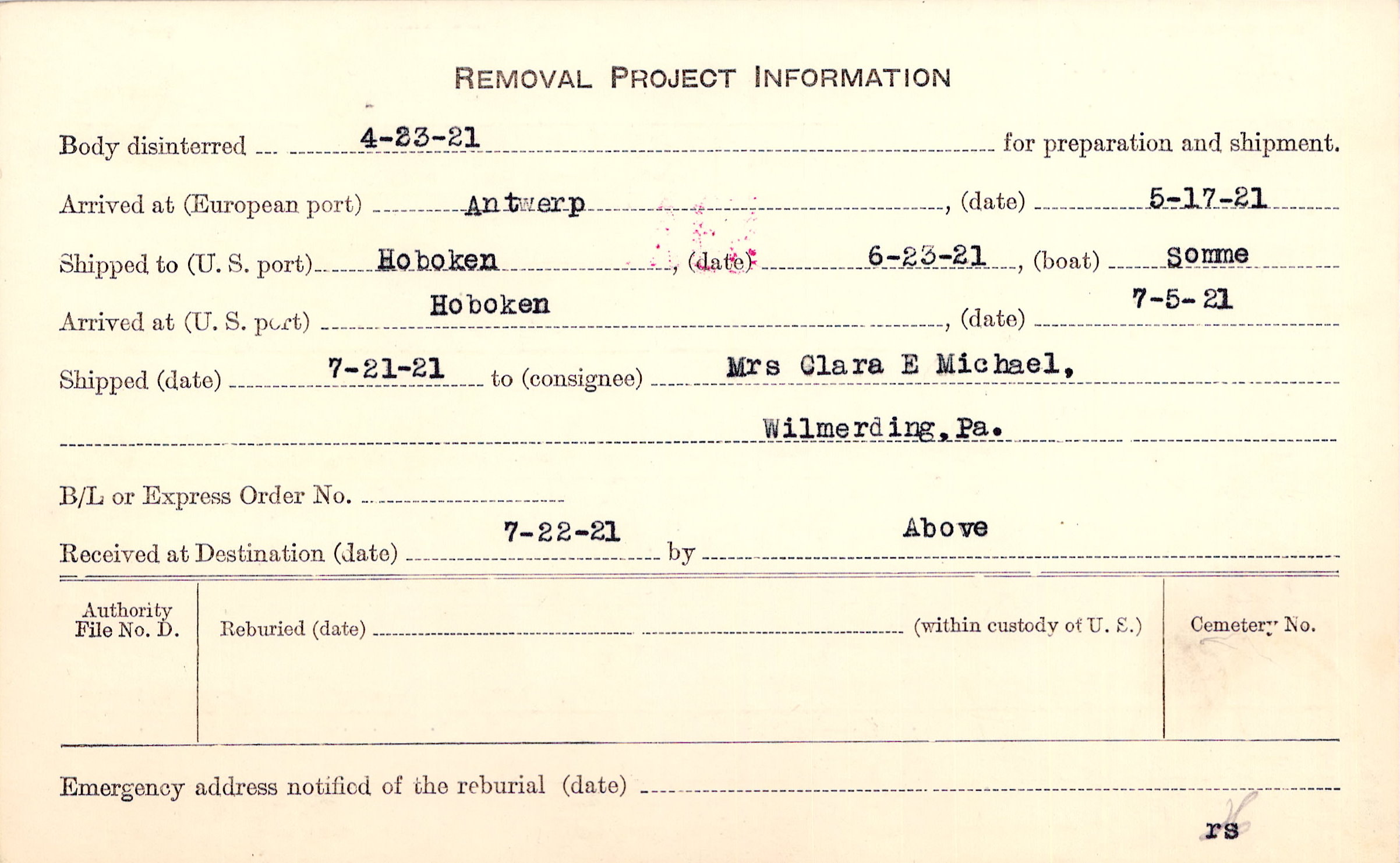 Body disinterred 4/23/1921 for preparation and shipment.