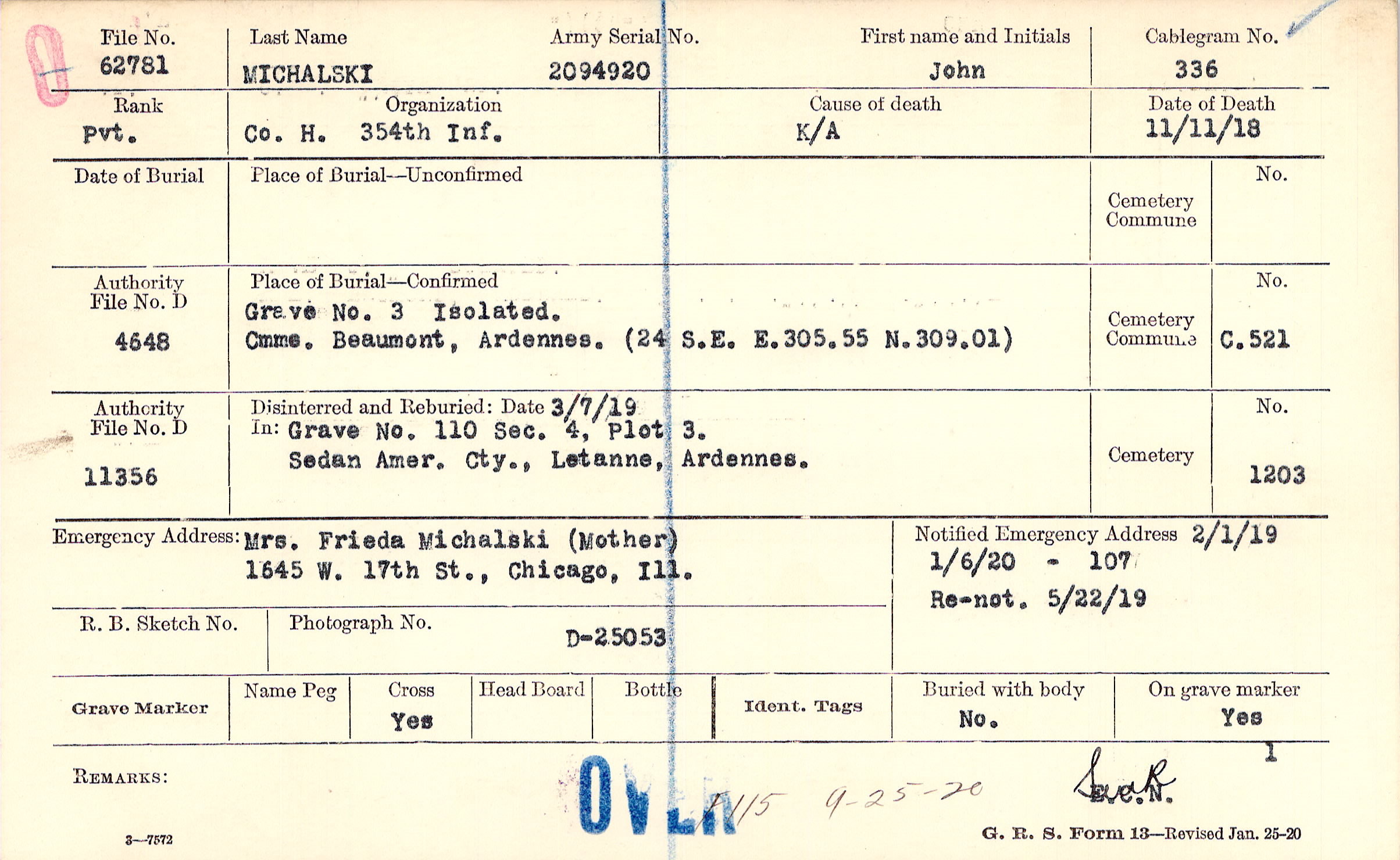 Mrs. Frieda Michalski (Mother), 1645 W. 17th St., Chicago, Ill.