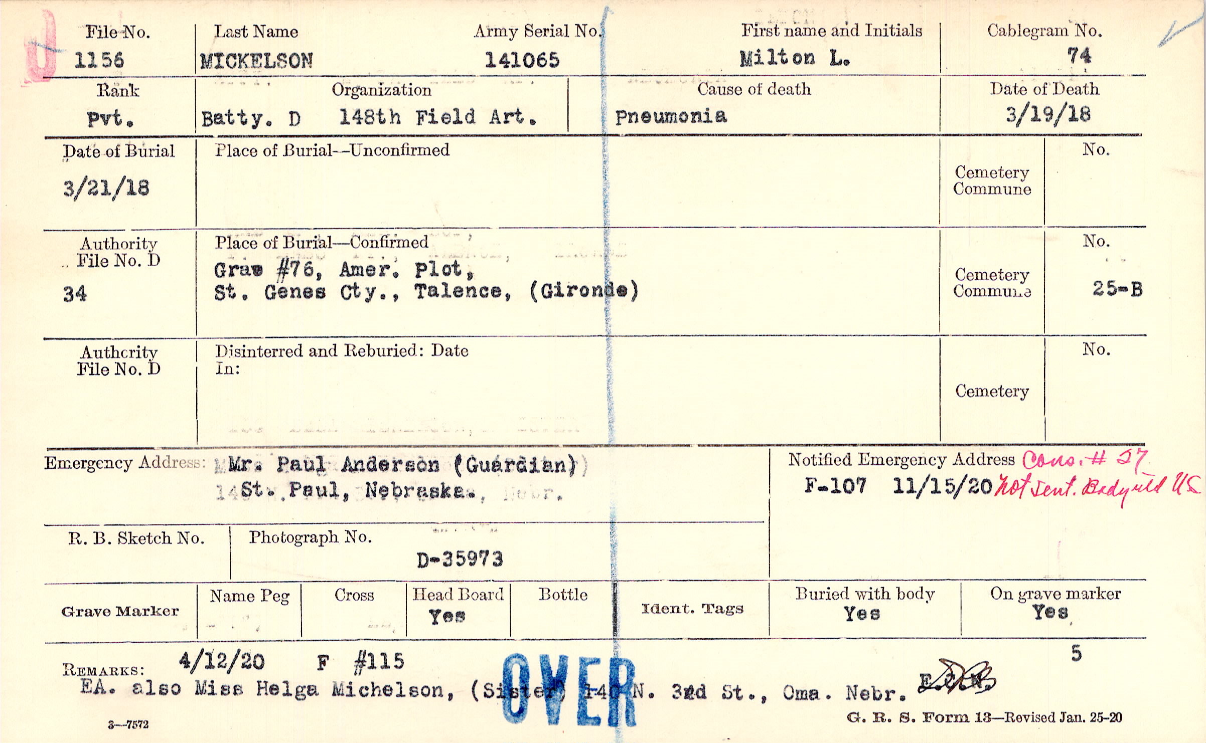EA. also Miss Helga Michelson, (Sister) 140N. 3rd St., Oma. Nebr., 4/12/20 F#115