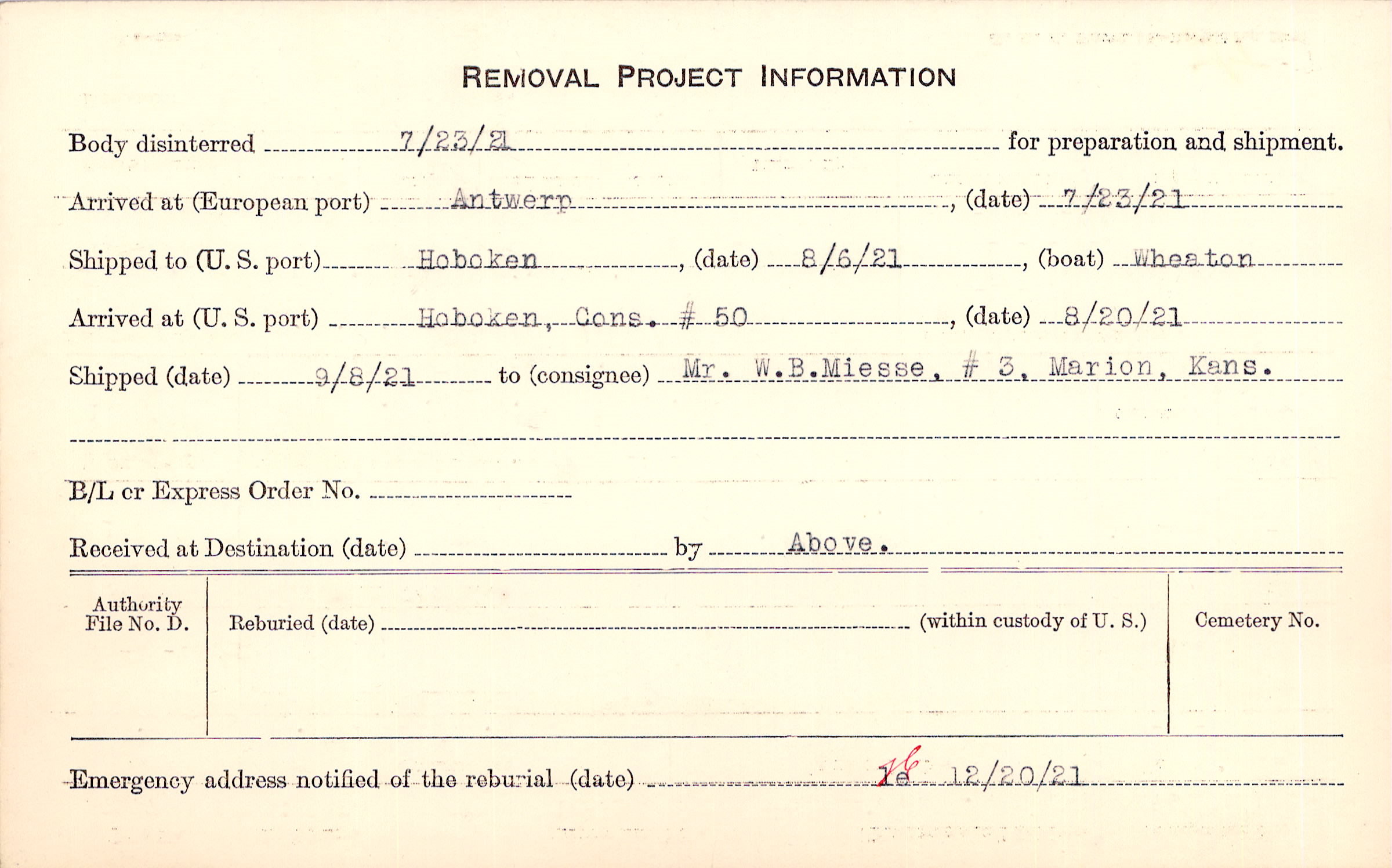 Body disinterred 7/23/1921 for preparation and shipment.
