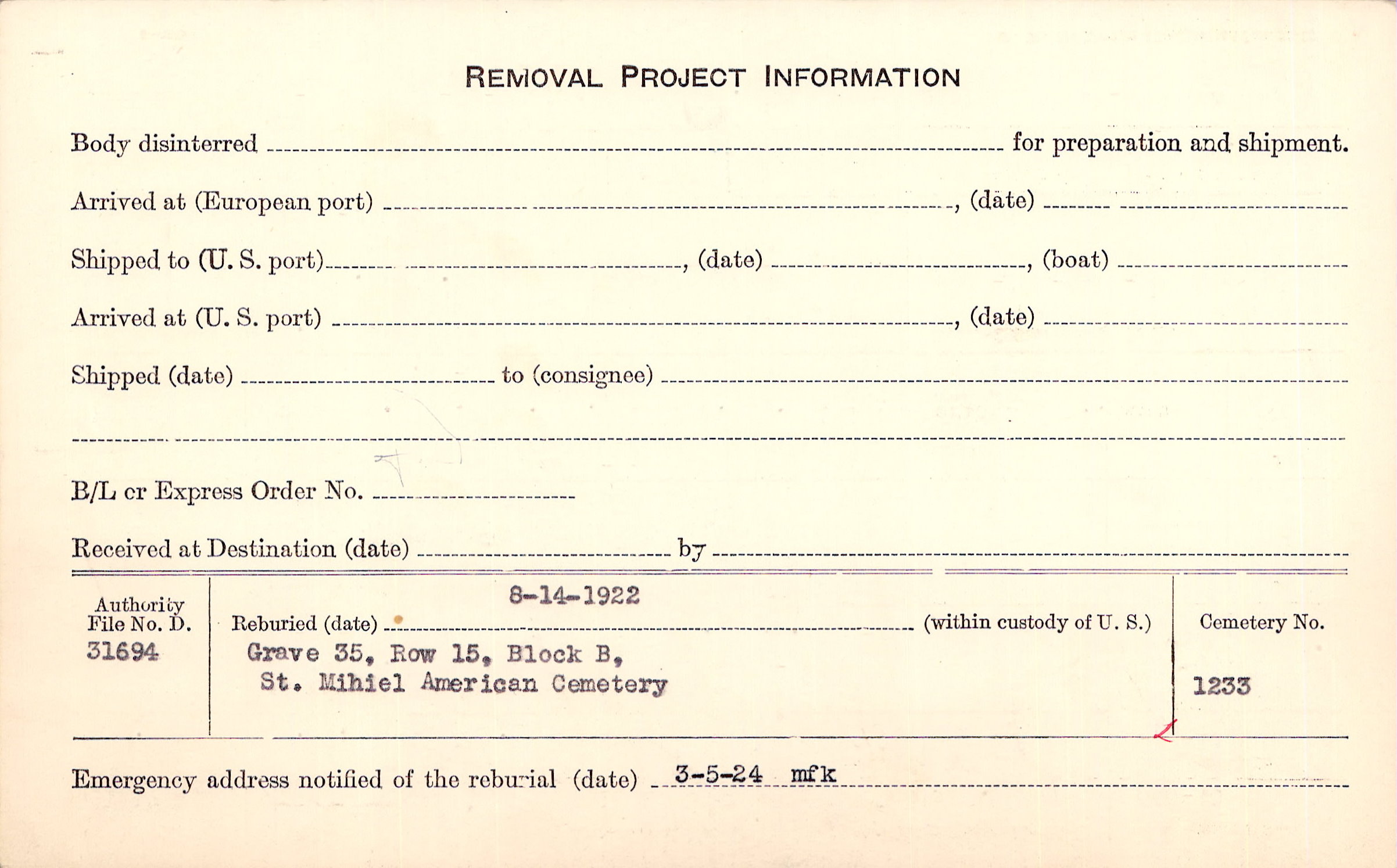 | Permanent Burial in Foreign Cemetery |