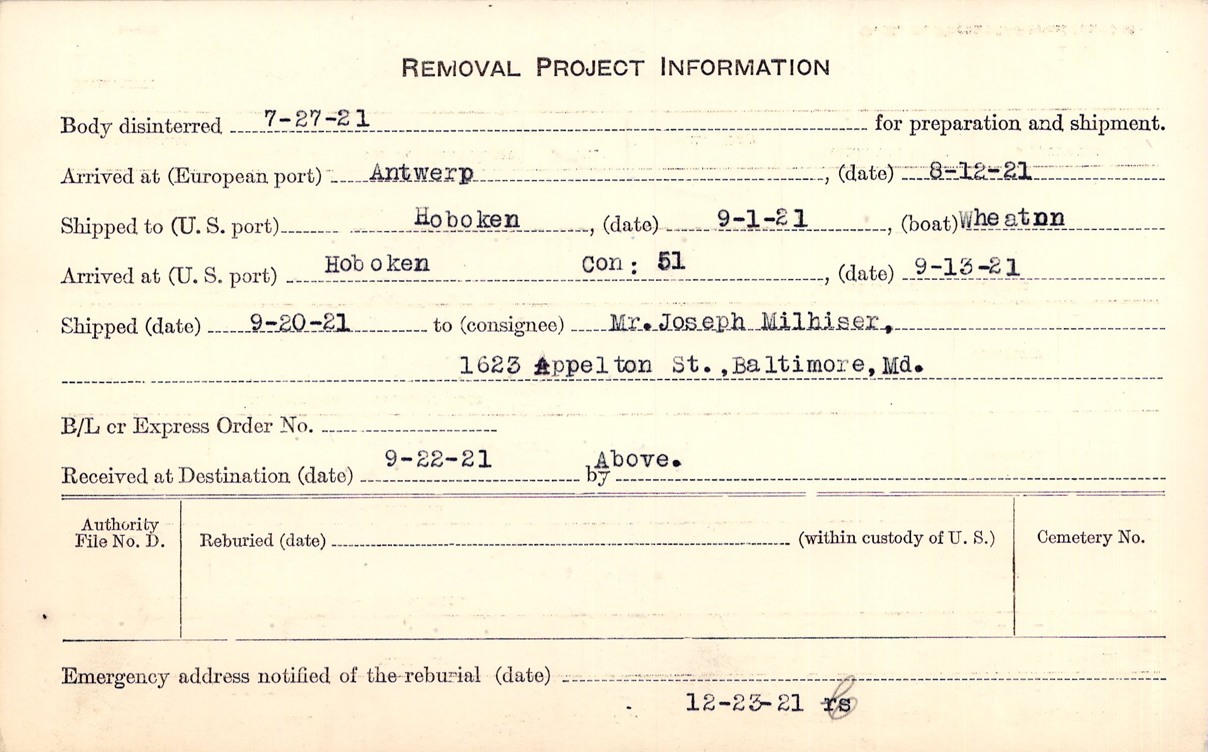 Body disinterred 7/27/1921 for preparation and shipment.