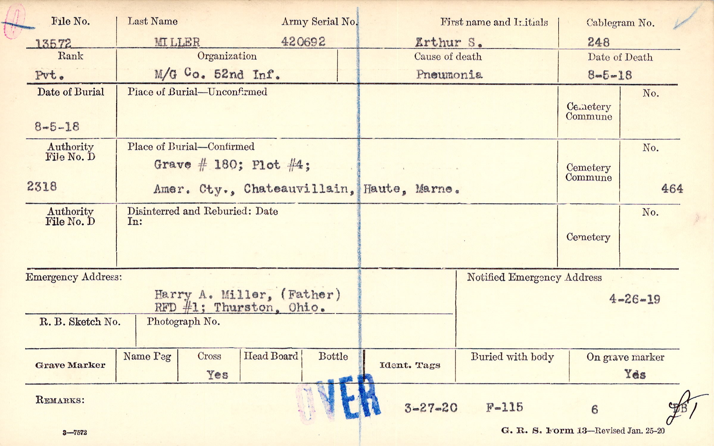Grave #180, Plot #4, Amer. Cty., Chateauvillain, Haute, Marne.