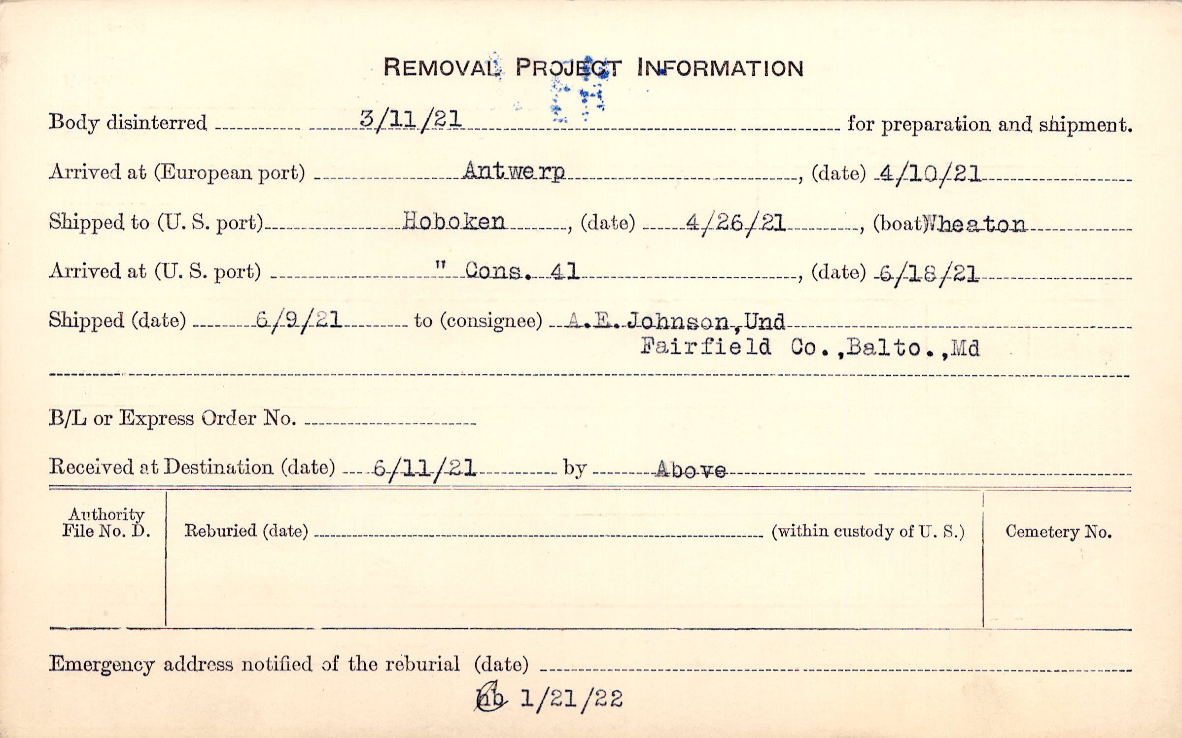 Body disinterred 3/11/1921 for preparation and shipment.