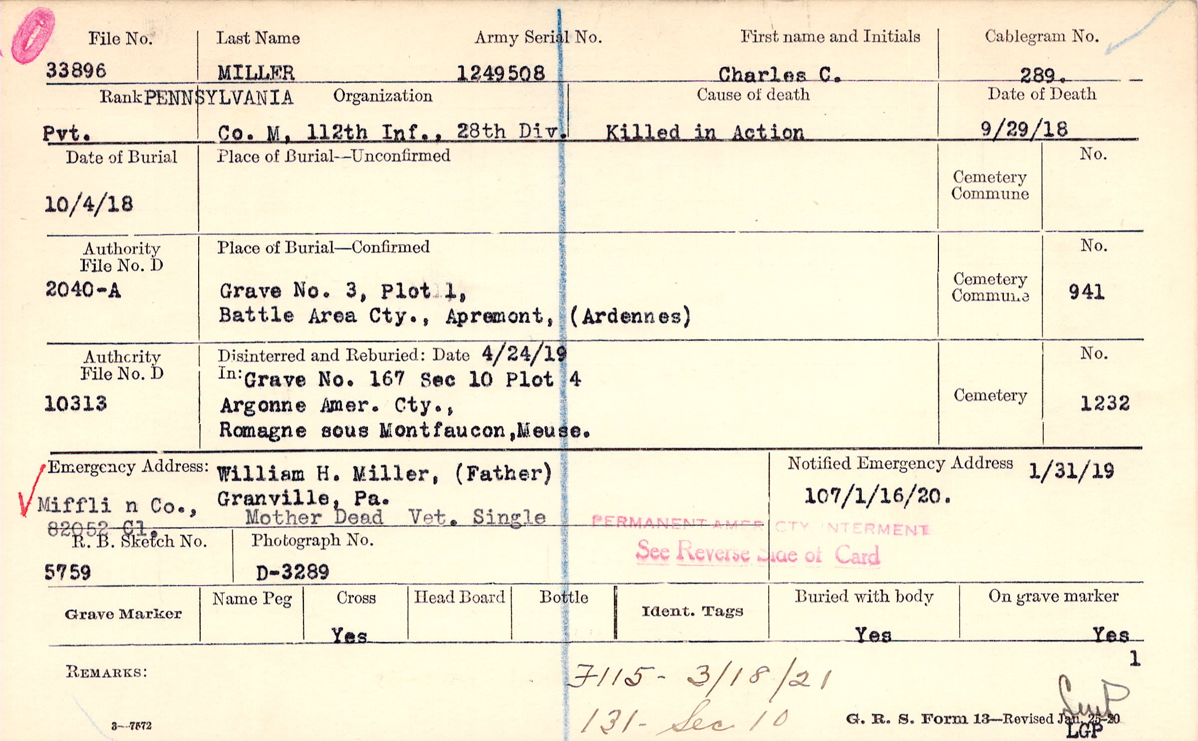 William H. Miller, (Father), Granville, Pa., Miffli n Co., 82052 Cl. Mother Dead Vet. Single