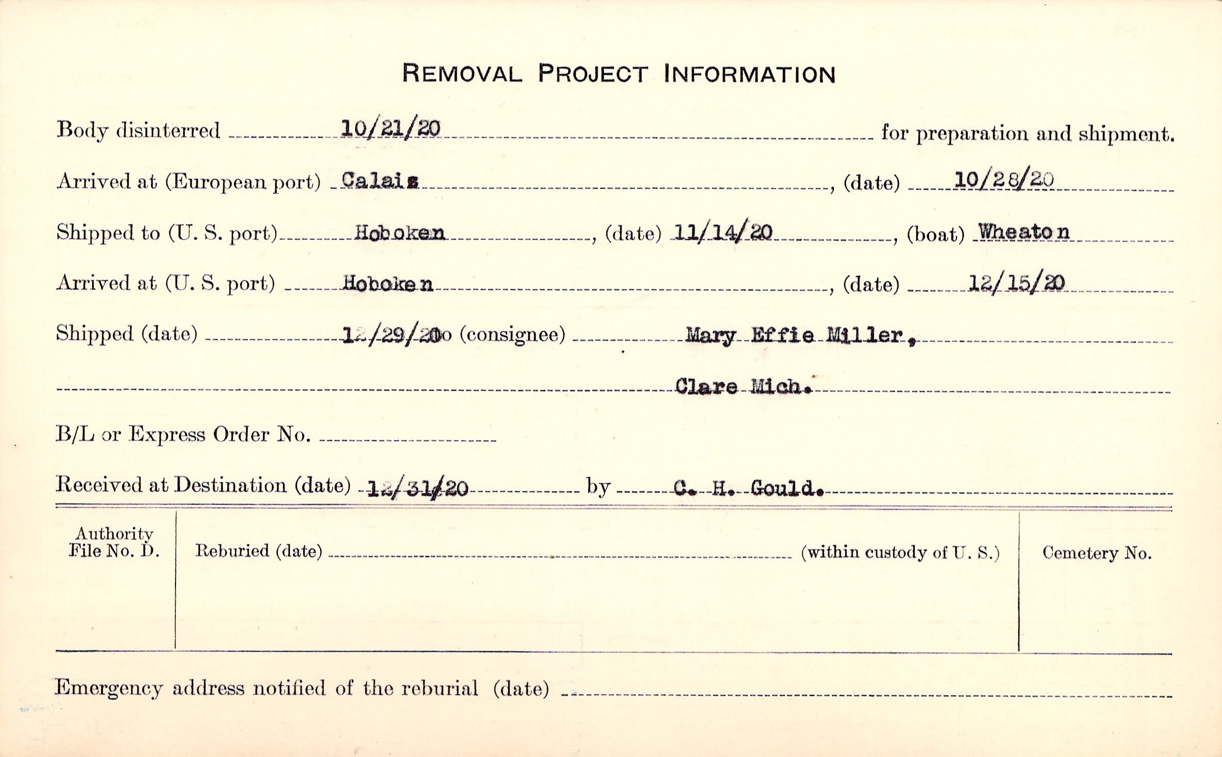Body disinterred 10/21/1920 for preparation and shipment.