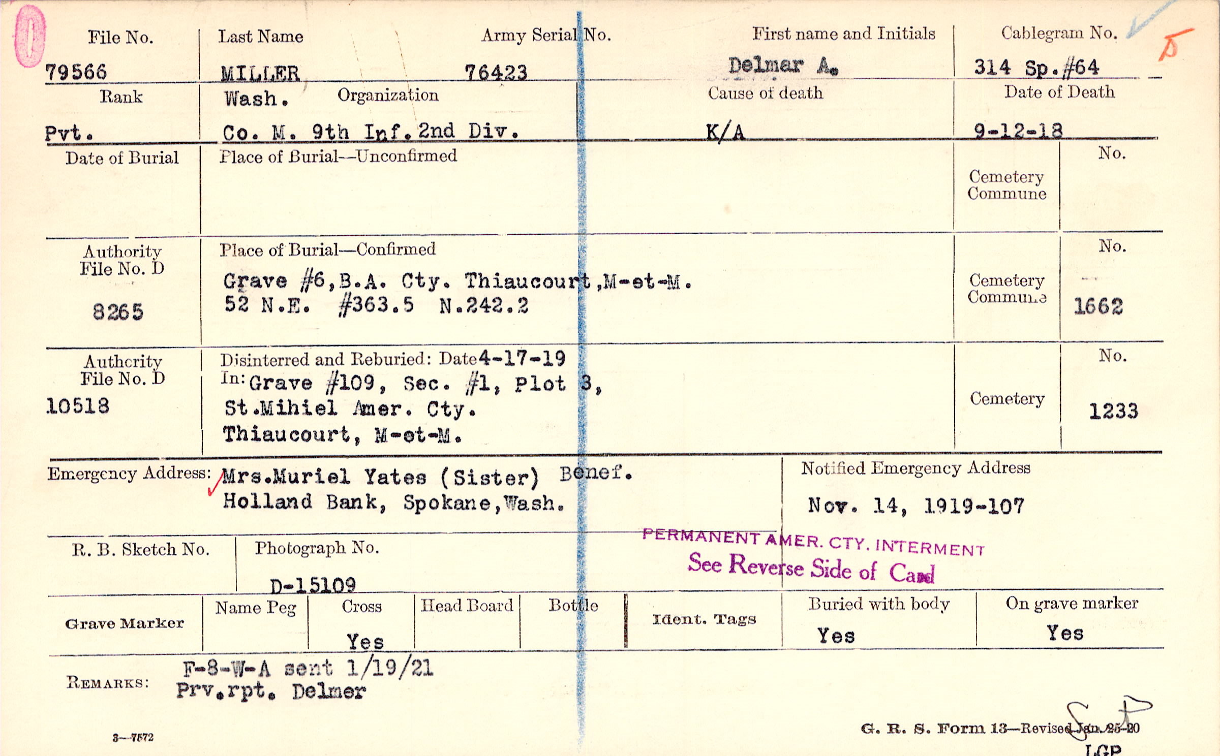 Grave 109, Section 1, Plot 3, St. Mihiel American Cemetery, Thiaucourt, Meurthe-et-Moselle