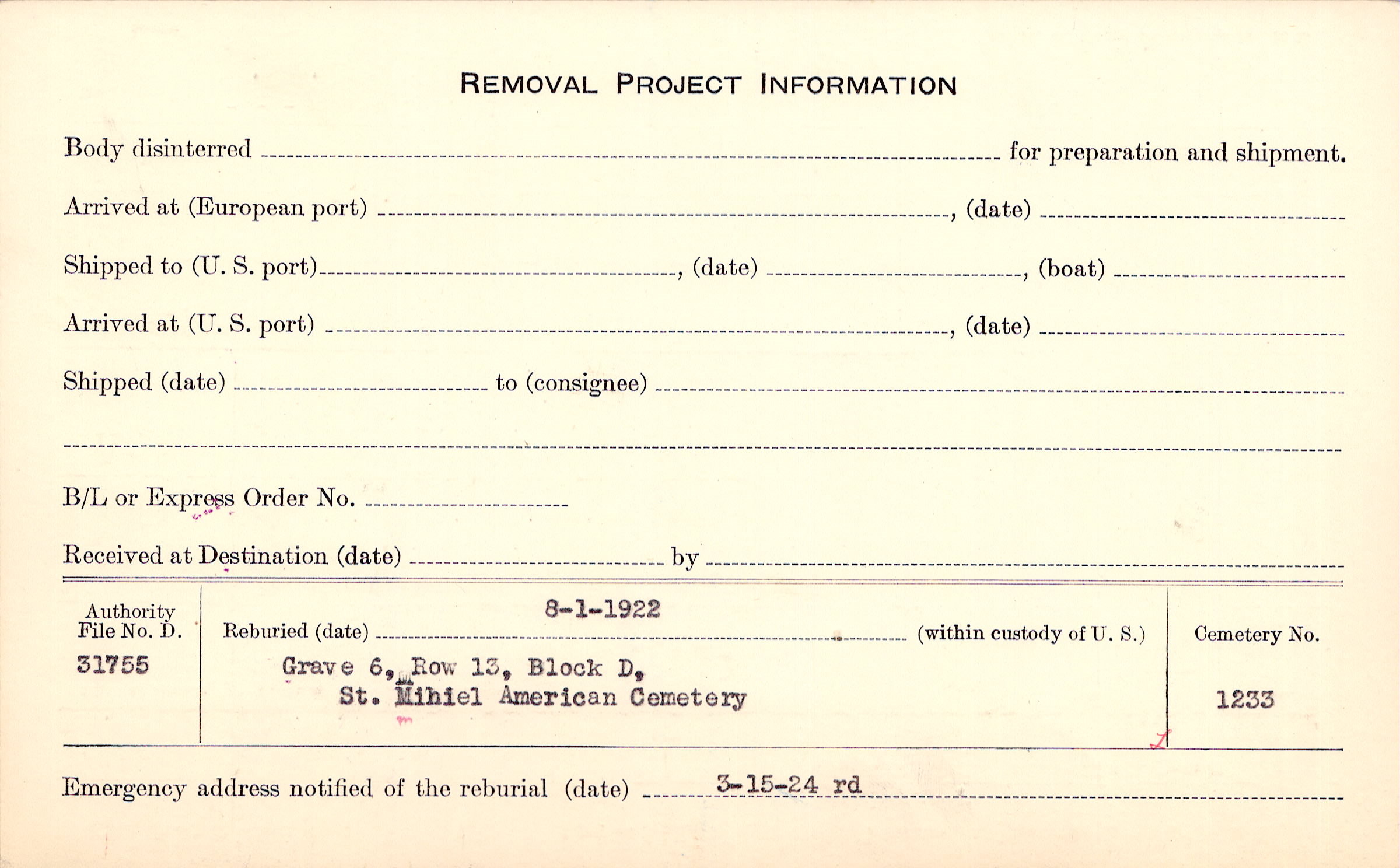 | Permanent Burial in Foreign Cemetery |