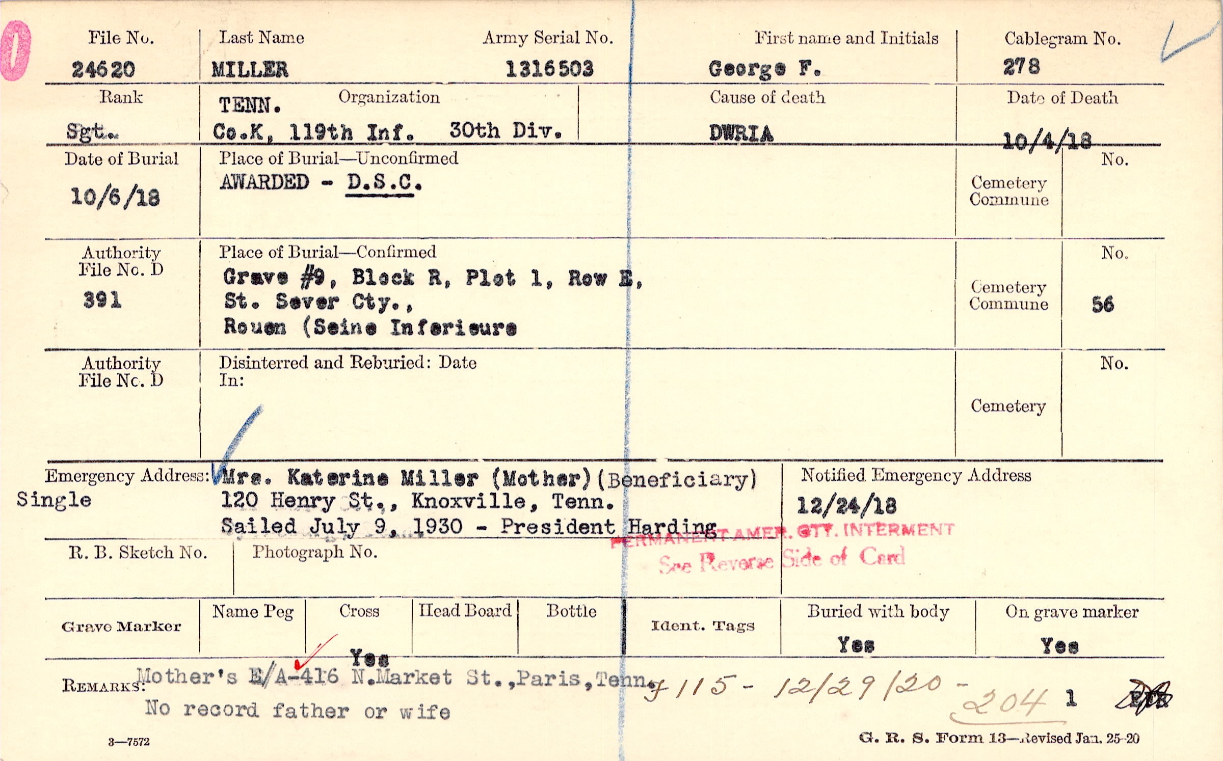 Mrs. Katerine Miller (Mother), 120 Henry St., Knoxville, Tenn., Single Sailed July 9, 1930 - President Harding (Beneficiary)